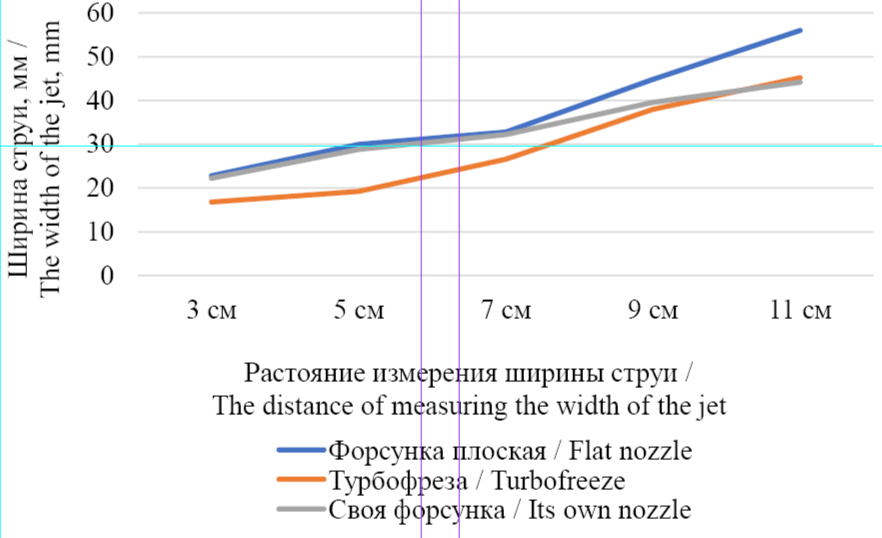 Как видно из графика (рис. 5), разработанная турбо форсунка имеет аналогичный с турбофрезой размер при высоте обработки 11 см. Однако значительно выигрывает в ширине при уменьшении высоты измерения до 3 см, приближаясь по ширине к форсунке с плоской струей. Полученный результат позволяет утверждать, что при наиболее эффективных значениях высоты обработки разработанная турбо форсунка будет иметь большую ширину захвата и повышенную производительность [26].