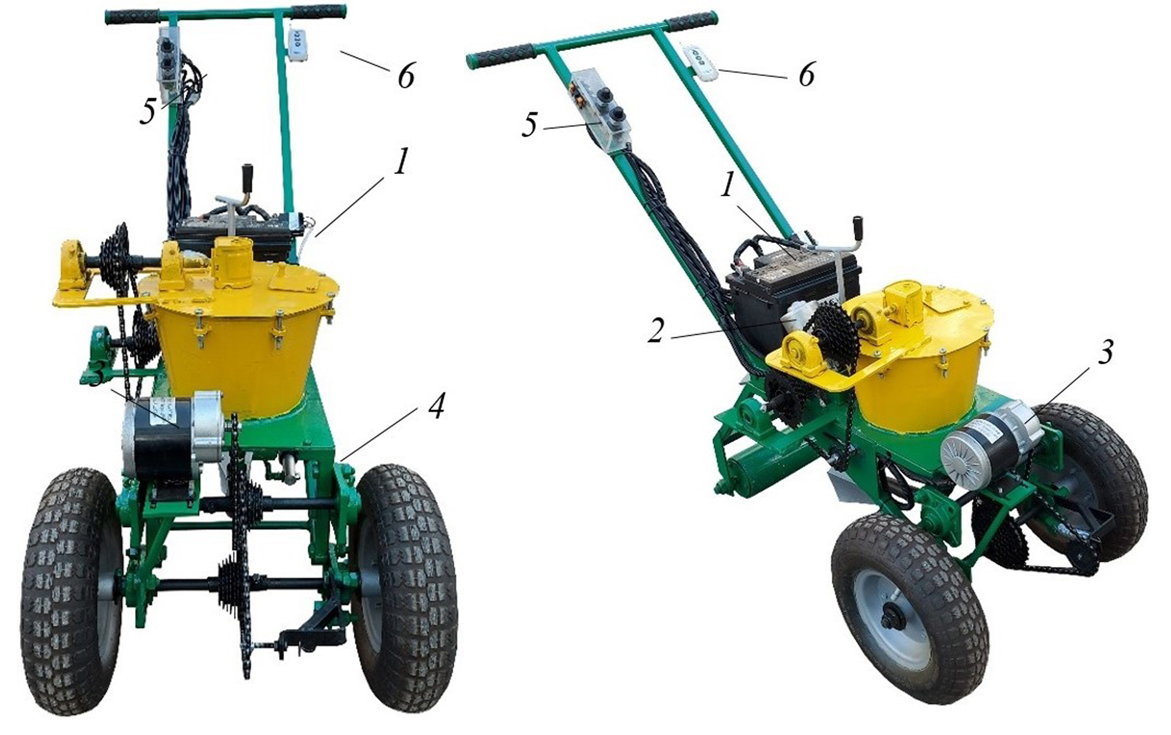 F i g. 9. Automated hydroseeder with electric drive of agitator and flap: a) front view; b) general view; 1 – battery; 2 – geared motor for agitator drive; 3 – motor for wheel drive; 4 – electric drive of flap; 5 – buttons for wheel drive, agitator, electric cylinder; 6 – remote control unit. The photos are made by E.V. Truflyak, 2023