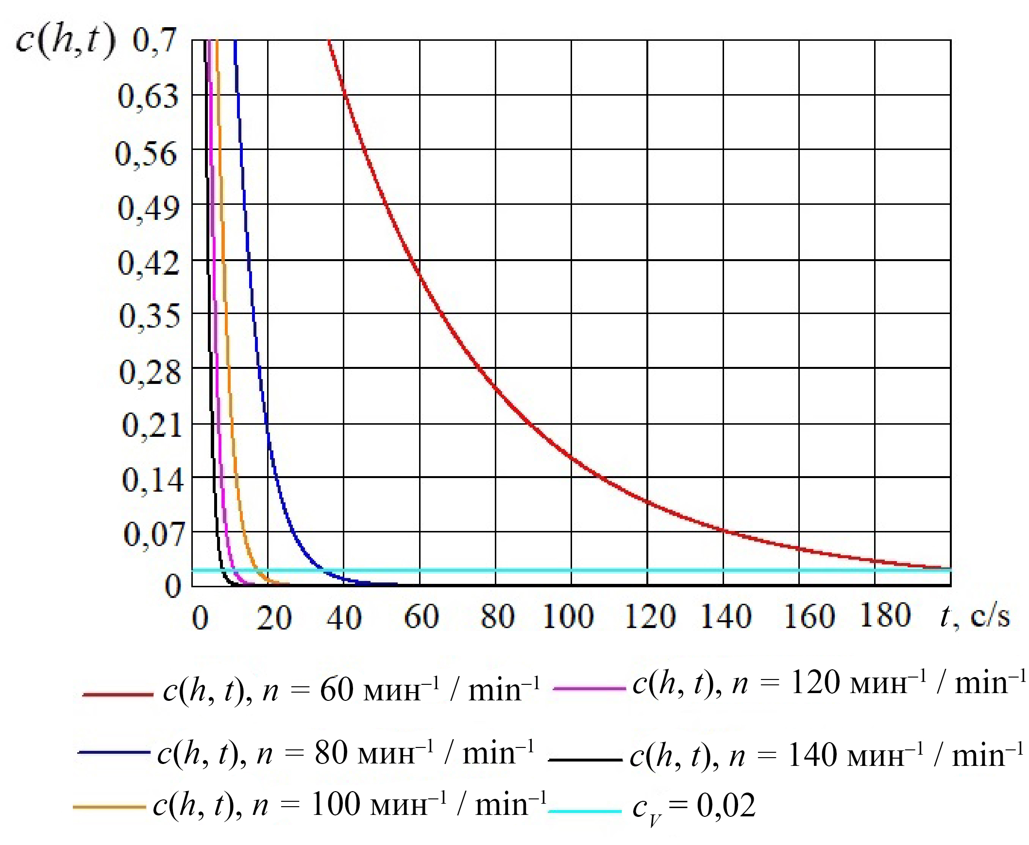 Графики зависимости (4) концентрации семян в несущей среде при h = Нрез от времени их пребывания в несущем потоке при различном числе оборотов мешалки представлены на рисунке 16.