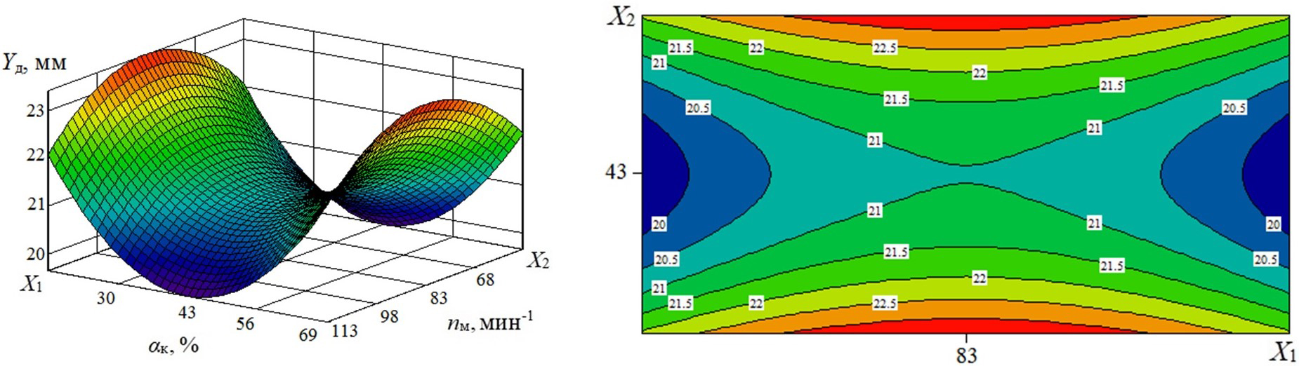 В качестве примера покажем поверхность оптимального значения коэффициента вариации шага посева по длине ряда (Yд, мм) от частоты вращения мешалки (nм, мин–1) и величины открытия крана (αк, %) при скорости движения сеялки Vc = 3,1 км/ч (рис. 18).