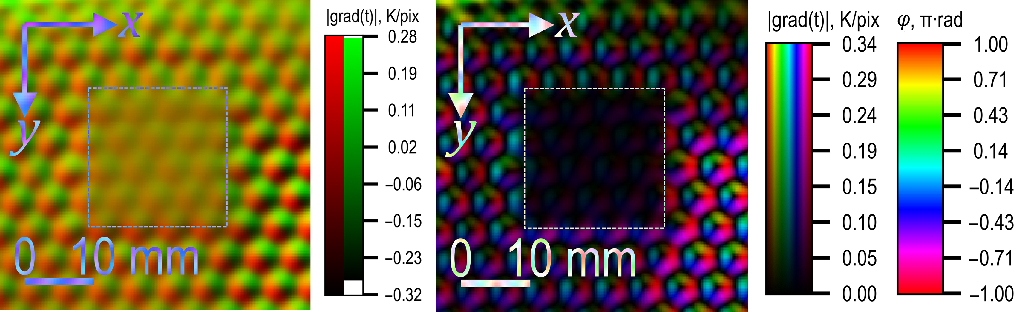 To verify this assumption, there was selected a thermal film frame immediately following after the heater output of the flaw area. Using specialized software, the gradient values in the frame were calculated. The gradient for each point was calculated on a circular area with a radius of 6 pixels. This radius was chosen so that the gradient calculation area corresponded to the size of the area of monotonic temperature change, which made it possible to estimate the temperature gradient created by heat leakage into the nearest wall. Since the gradient was proportional to this leakage, and the amount of leakage depended on the flaw presence, the gradient can be used to determine flaw in the area of a selected point. In this case, gradients along the x and y axes were calculated as the coefficient of linear regression of temperature on the corresponding coordinate. This approach suppresses the noise, since each coefficient results from processing many pixels. Using the linear regression coefficients of temperature from x and y, the gradient magnitude and its direction (i.e., the polar coordinates of the gradient vector) were calculated. Figure 2 shows the obtained results.