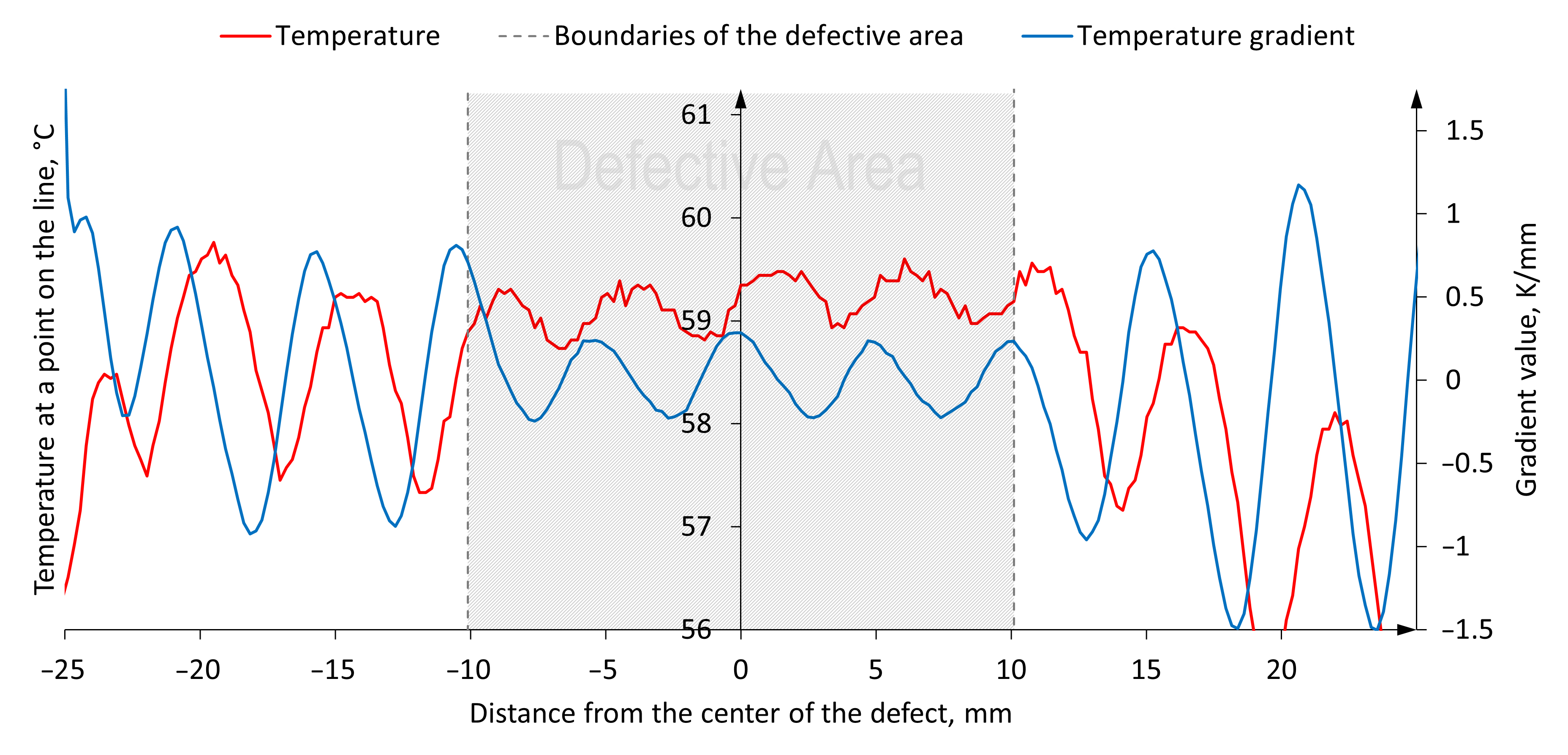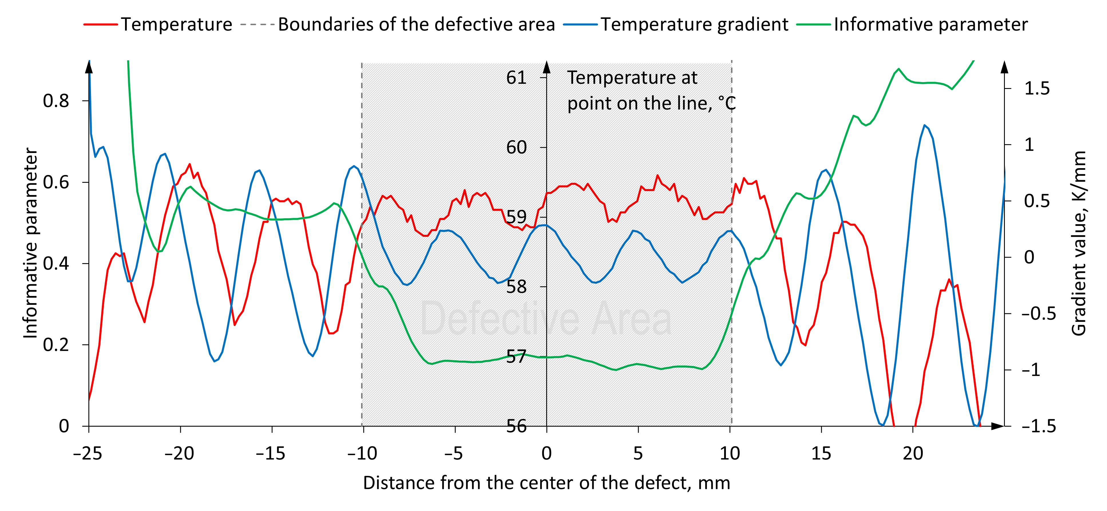The graph (Fig. 5) clearly shows that the selected informative parameter had a lower value in the defective area. However, the choice of a specific threshold value that would allow reliable defect detection was impossible without additional processing. Therefore, it was necessary to calculate the gradient value over a larger number of pixels and take measures to reduce the noise inherent to the method.
