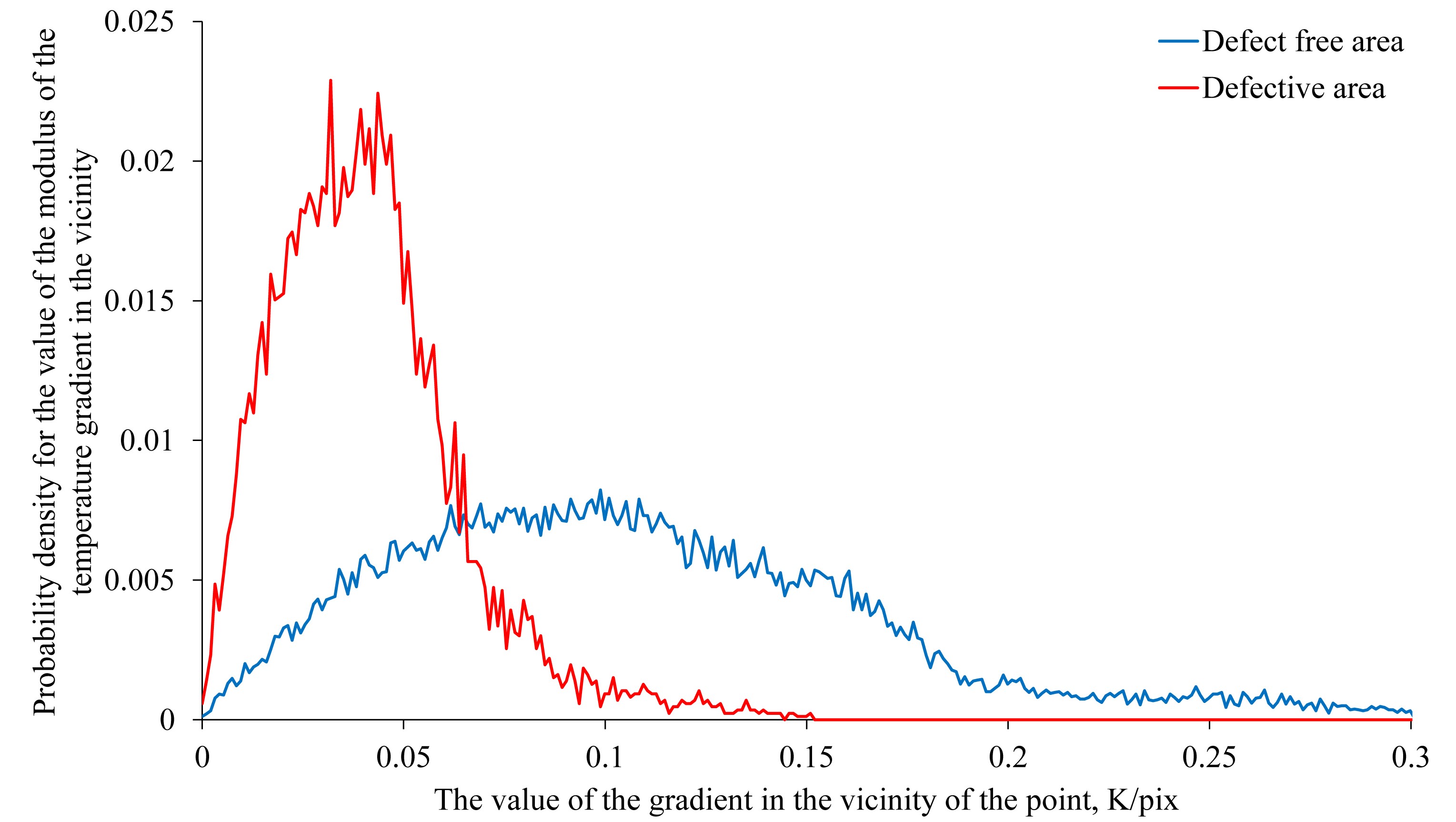 To estimate the change of thermal flow in defect area the simplest informative parameter, calculated as a moving average of the absolute value of the surface temperature gradient can be used.