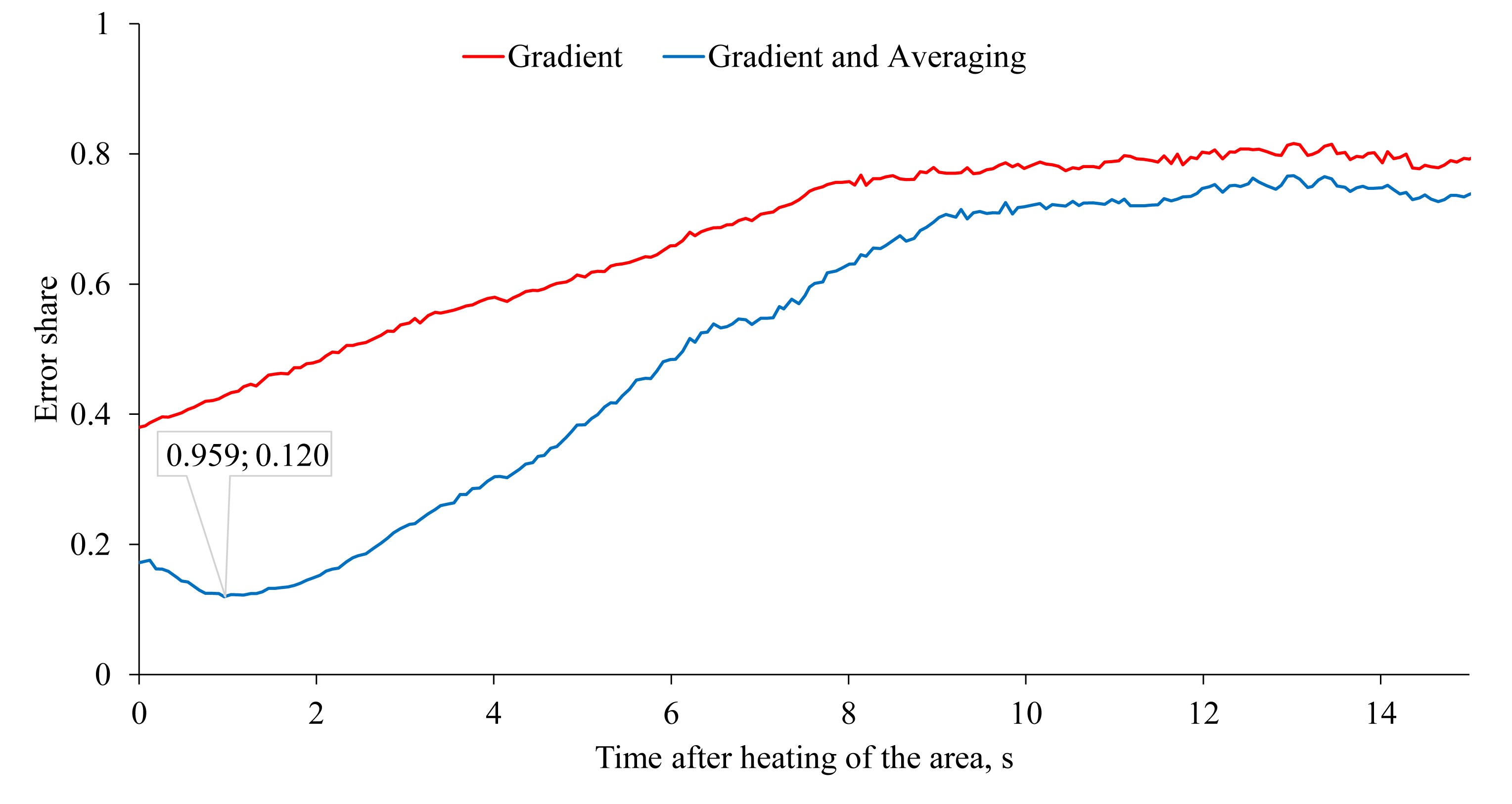 As can be seen from the Figure 7, the minimum error value corresponded to the moment immediately after the lamp passes through and was about 38%. This value was quite large that brought the method closer in reliability to random guessing, and therefore it was necessary to improve the method to reduce the proportion of errors. The distribution curves of the gradient value at the moment of the greatest difference (immediately after the passage of the heater) overlapped significantly (Fig. 8).