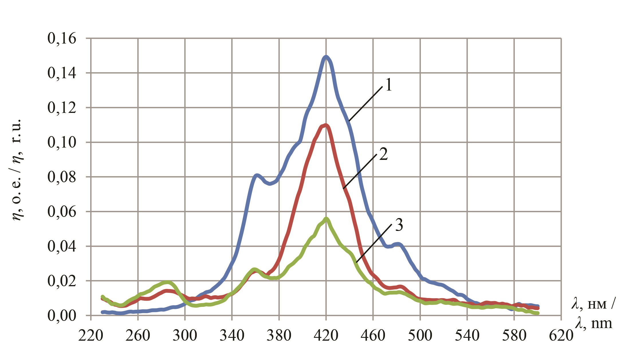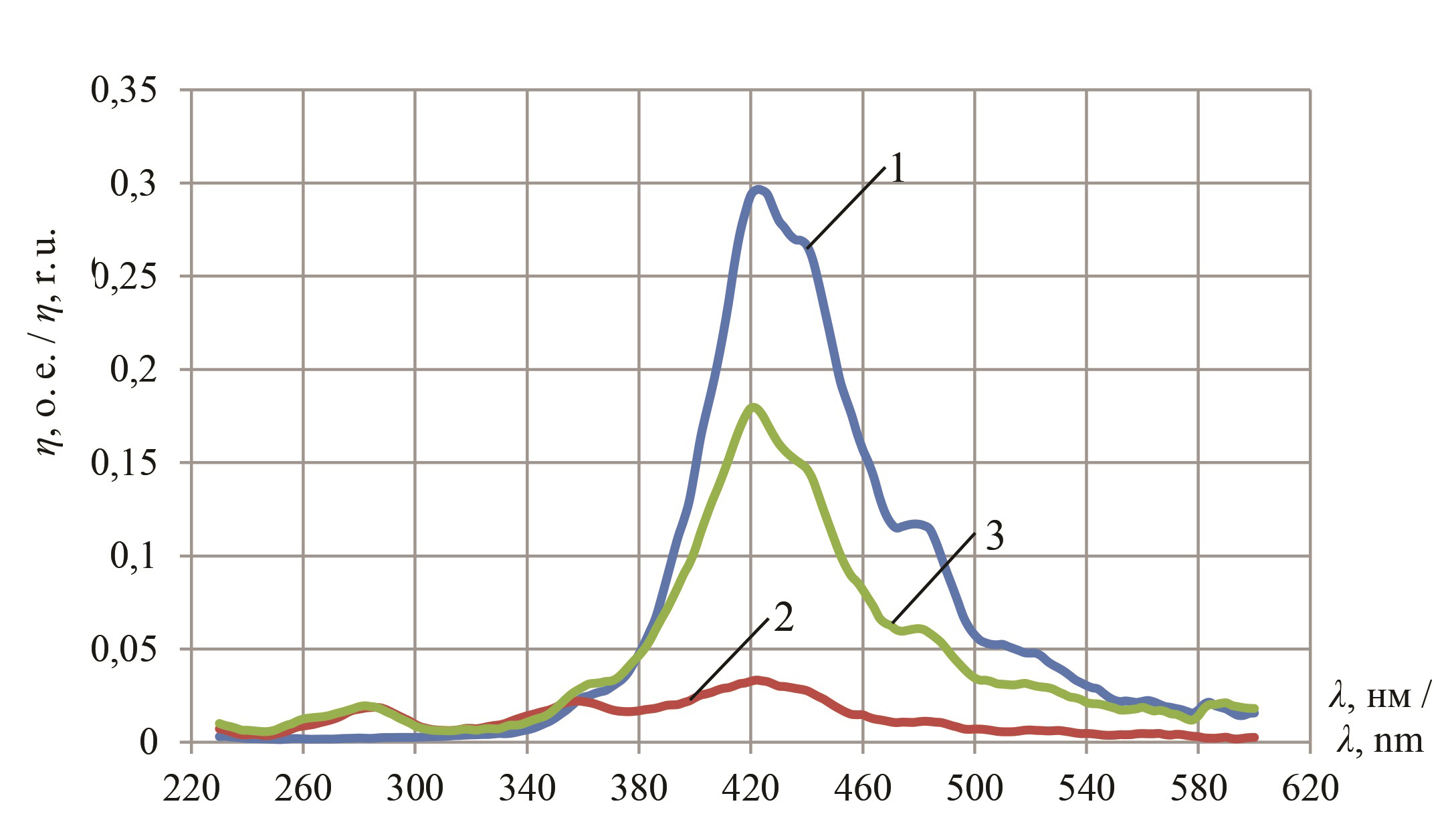 Измерения спектров возбуждения и люминесценции проводились на спектрофлуориметре СМ 2203 фирмы «Солар». Сначала измерялись характеристики возбуждения ηe(λ) в диапазоне от 230–600 нм по ранее разработанной методике [24]. На основе полученных результатов были измерены спектры фотолюминесценции φl(λ). По полученным спектральным хактеристикам вычислена интегральная поглощательная способность Η (в относительных единицах – о. е.) по формуле:
