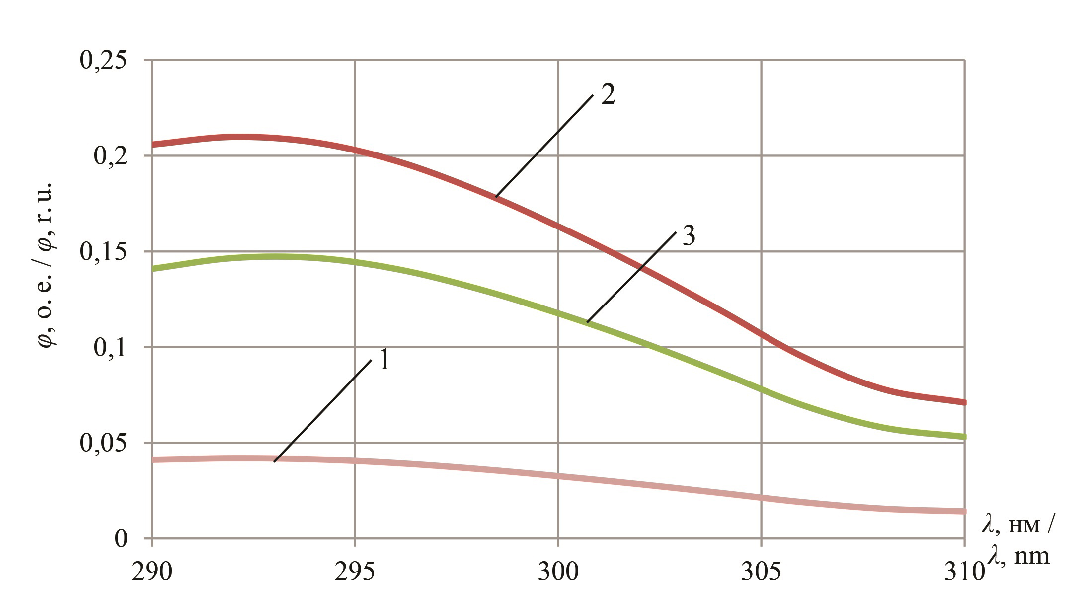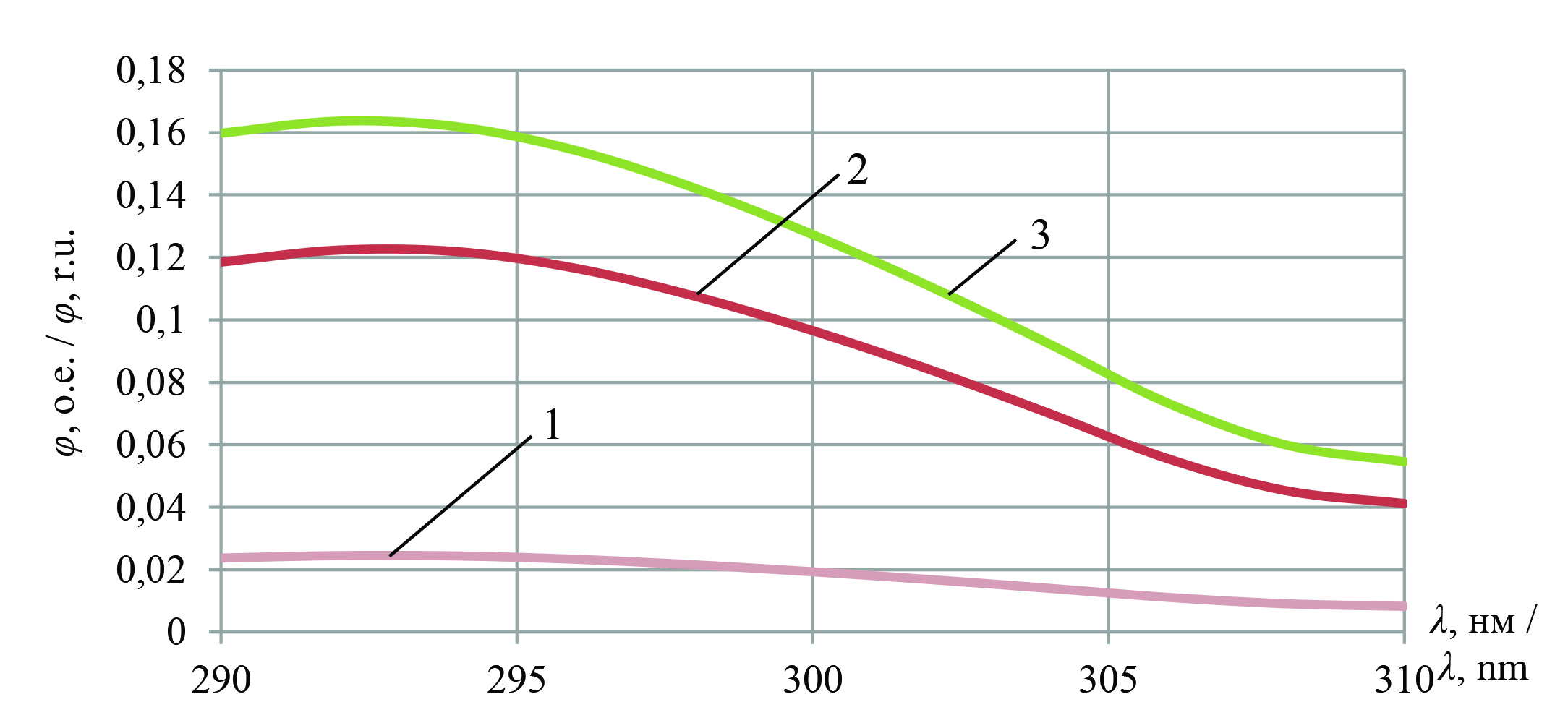 Р и с. 2. Спектральные характеристики люминесценции пшеницы при λв = 284 нм: 1 – здоровой; 2 – зараженной Fusarium graminearum; 3 – зараженной Alternaria alternata