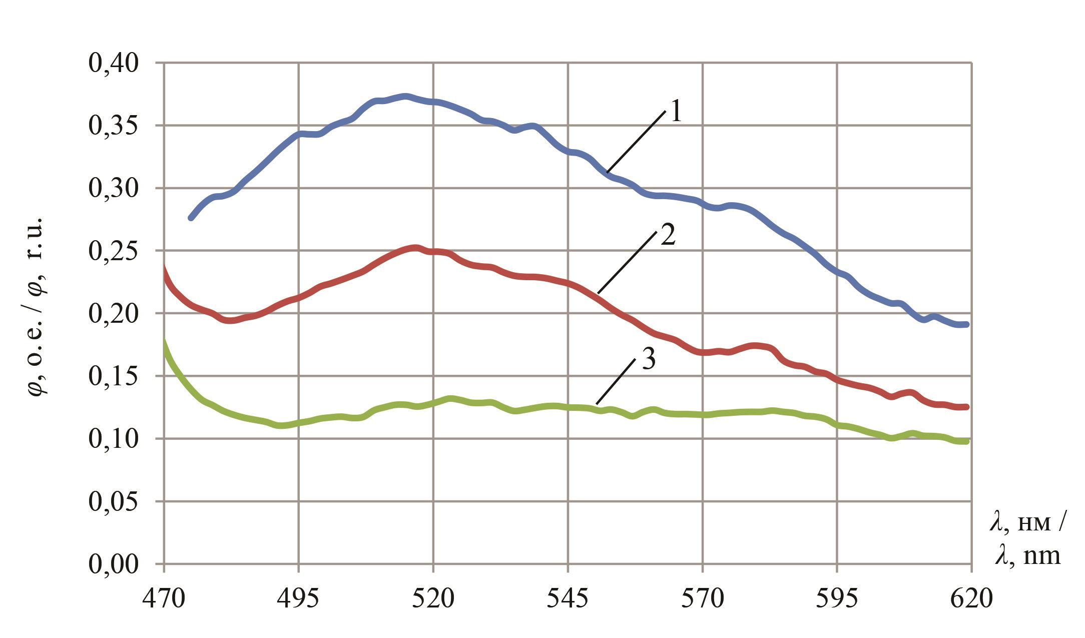 F i g. 6 Spectral characteristics of the luminescence of barley at λв = 424 nm: 1 – disease-free; 2 – infected with Fusarium graminearum; 3 – infected with Alternaria alternate