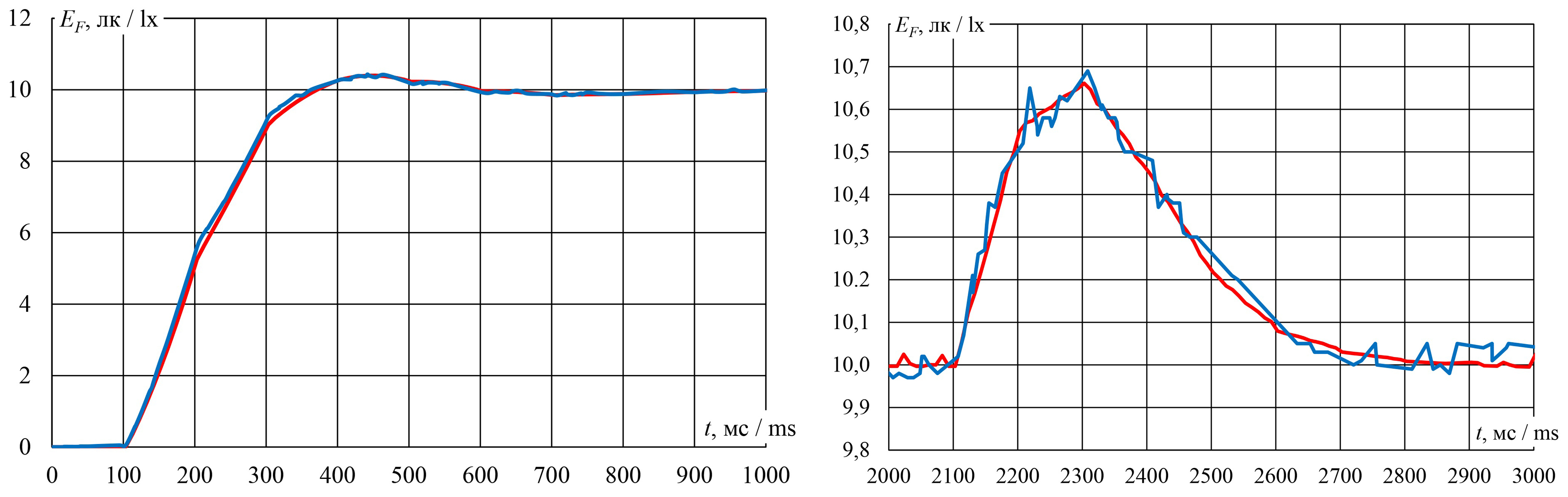 Ухудшение совпадения кривых переходных процессов в реальной САР и в ее компьютерной модели на малых уровнях заданной освещенности (рис. 11) связано с более существенным влиянием погрешностей измерений, помех и принятых в модели допущений. Несмотря на это, для EZ 1 лк модель достаточно достоверно описывает переходные процессы в САР, а используемые настройки ПИ-регулятора обеспечивают требуемое качество регулирования освещенности.