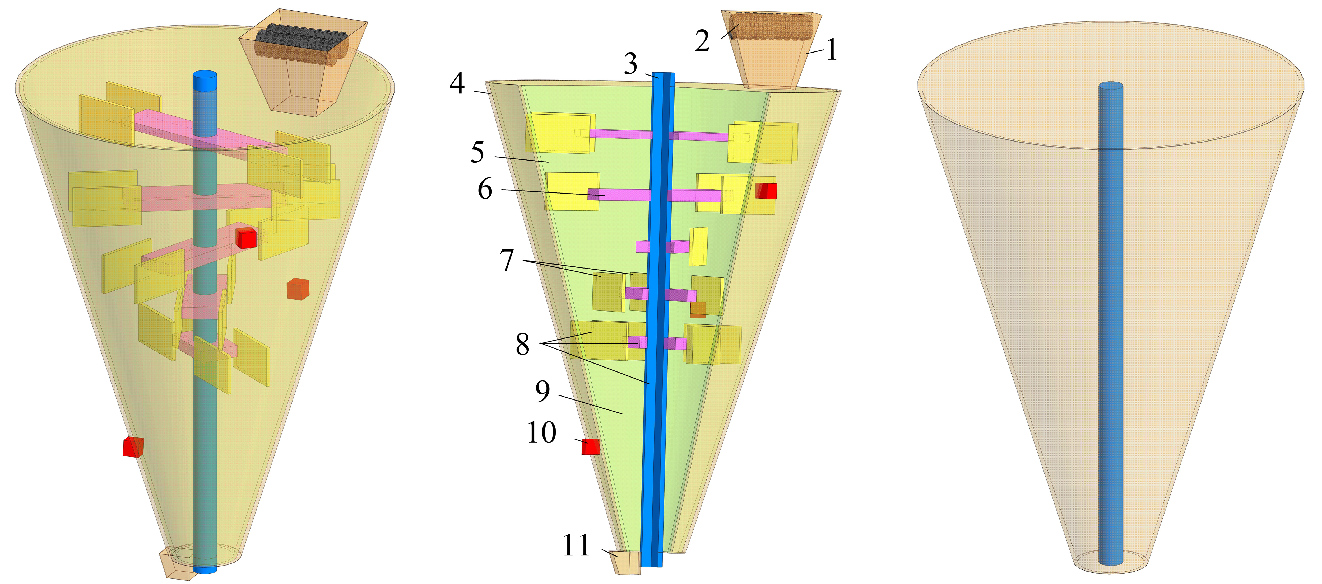 Р и с. 1. Цифровая модель СВЧ-установки для извлечения жира из костей убойных животных: a) общий вид; b) общий вид в разрезе с позициями; c) коаксиальный резонатор с коническим кольцевым пространством; 1 − загрузочная емкость; 2 − шредер; 3 − неферромагнитный вал бичевого ротора; 4 − неферромагнитный усеченный конус; 5 − диэлектрический усеченный конус; 6 − ступицы фторопластовые; 7 − билы из корунда; 8 − бичевой ротор; 9 − коаксиальный резонатор; 10 − магнетроны с волноводами; 11 − приемная емкость