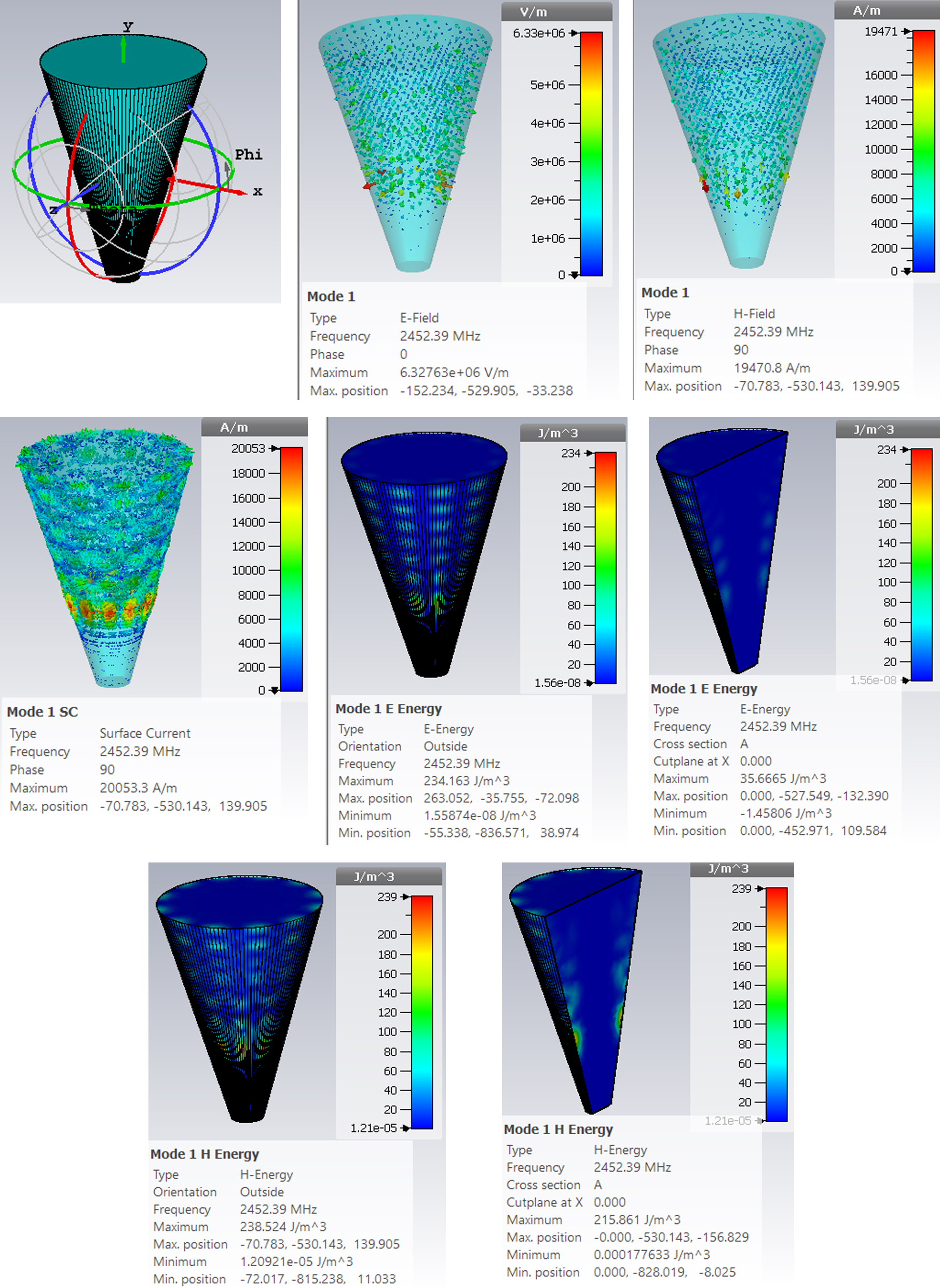 Результаты моделирования распространения микроволнового поля для коаксиального резонатора с коническим кольцевым объемом 115 979 см3 (рис. 2), выполненного в программном комплексе электродинамического моделирования CST Microwave Studio, Computer Aided Design (CAD) и Computer Aided Engineering (CAE), позволили получить распределение ЭМП по координатным осям, вычислить напряженность электрического поля, напряженность магнитного поля, поверхностный ток, энергию электрического и магнитного полей.