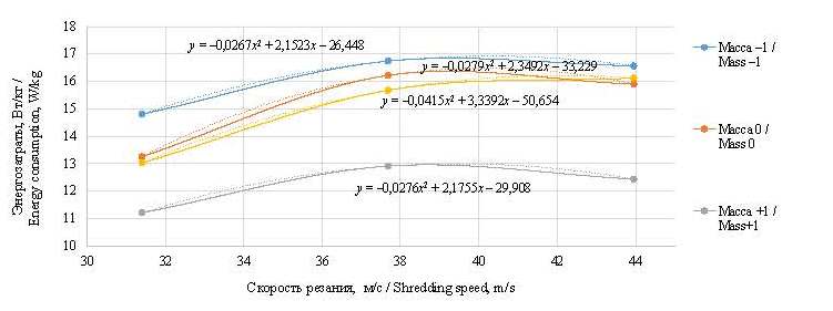 Как видно, с увеличением скорости резания энергозатраты возрастают, что соответствует увеличению интенсивности процесса измельчения более крупных веток, требующих больше энергии для их обработки.