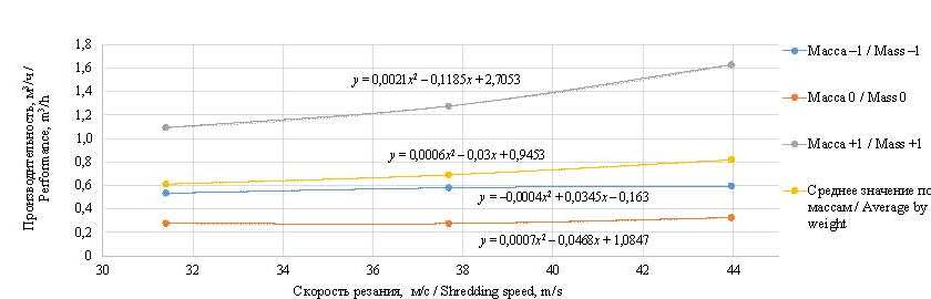 Для веток диаметром до 20 мм: при скорости резания 31,4 м/с производительность равна 0,4138 м³/ч; при скорости резания 37,68 м/с – 0,4246 м³/ч; при скорости резания 43,96 м/с – 0,4300 м³/ч. Для веток меньшего диаметра увеличение скорости резания приводит к более слабо выраженному росту производительности. Несмотря на повышение скорости, производительность не достигает значений, близких к 0,8 м³/ч, что объясняется меньшим объемом измельчаемой массы.