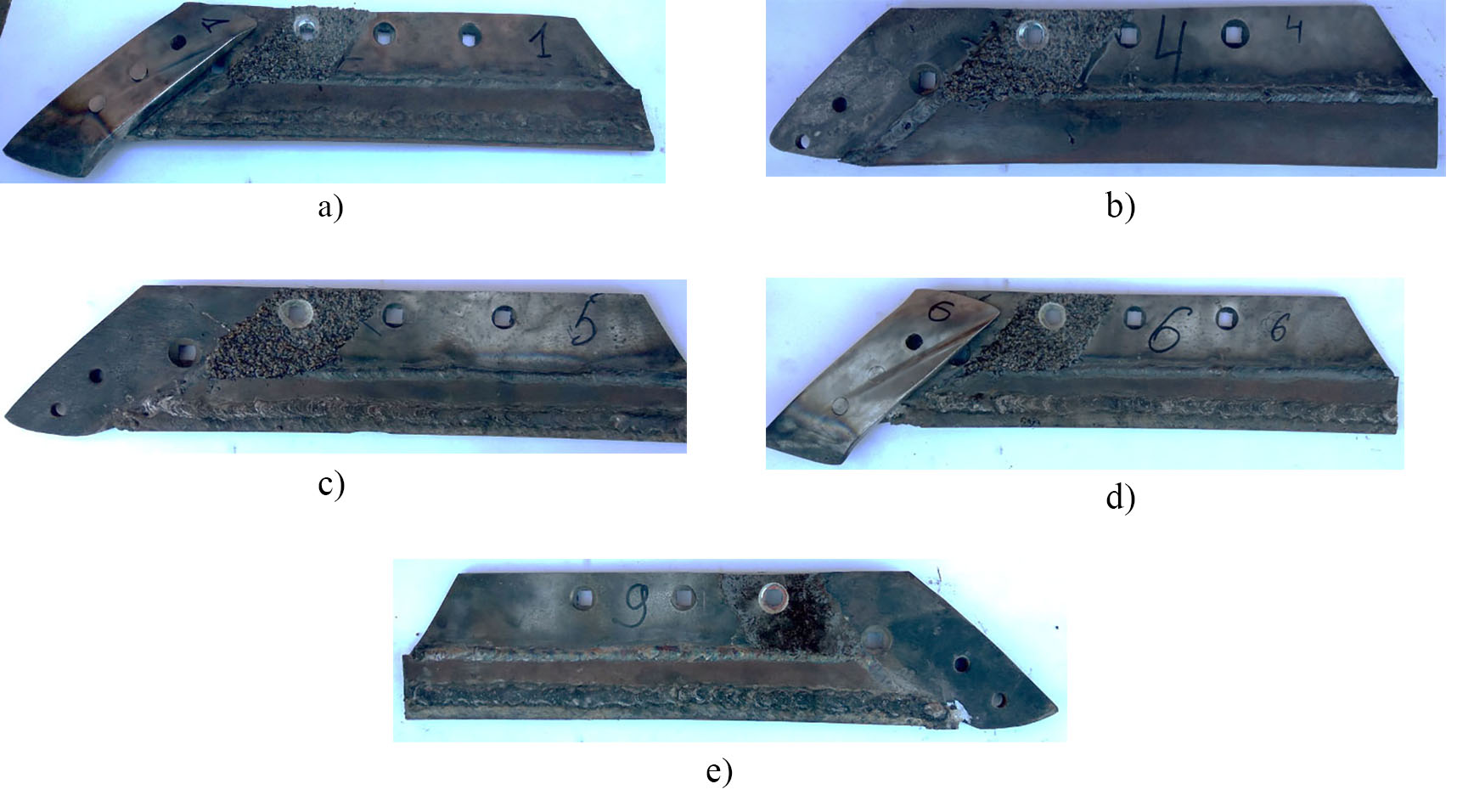 Лемехи, восстановленные методом ТКЭ, имеют меньшую износостойкость и, соответственно, меньший ресурс по сравнению с новыми. Одним из ключевых преимуществ данной конструкции является ее способность предотвращать образование лучевидного износа, что повышает эффективность работы лемеха при вспашке абразивных почв, таких как супесь. Хотя повышение твердости до 53 HRC существенно повышает износостойкость [27; 28], широкое внедрение этой технологии ограничено из-за дополнительных затрат, необходимых для реализации термической обработки. Нельзя также не упомянуть о возможности разрушения детали под воздействием ударных нагрузок, возникающих в процессе эксплуатации.