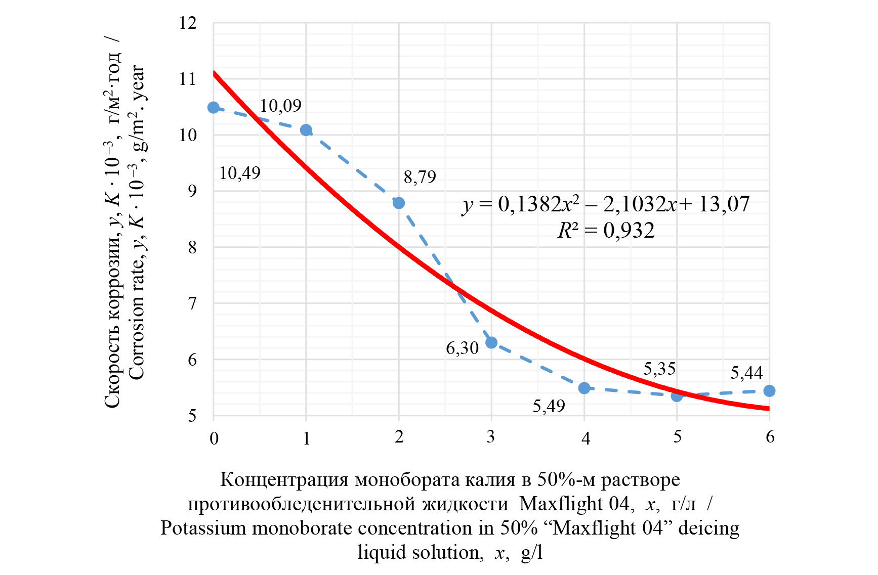 – линия тренда (полиномиальная); R² – коэффициент достоверностиFig. 1. Corrosion rate dependence of V95pch alloy in 50% “Maxflight 04” deicing liquids solution on potassium monoborate concentration for 30 days: