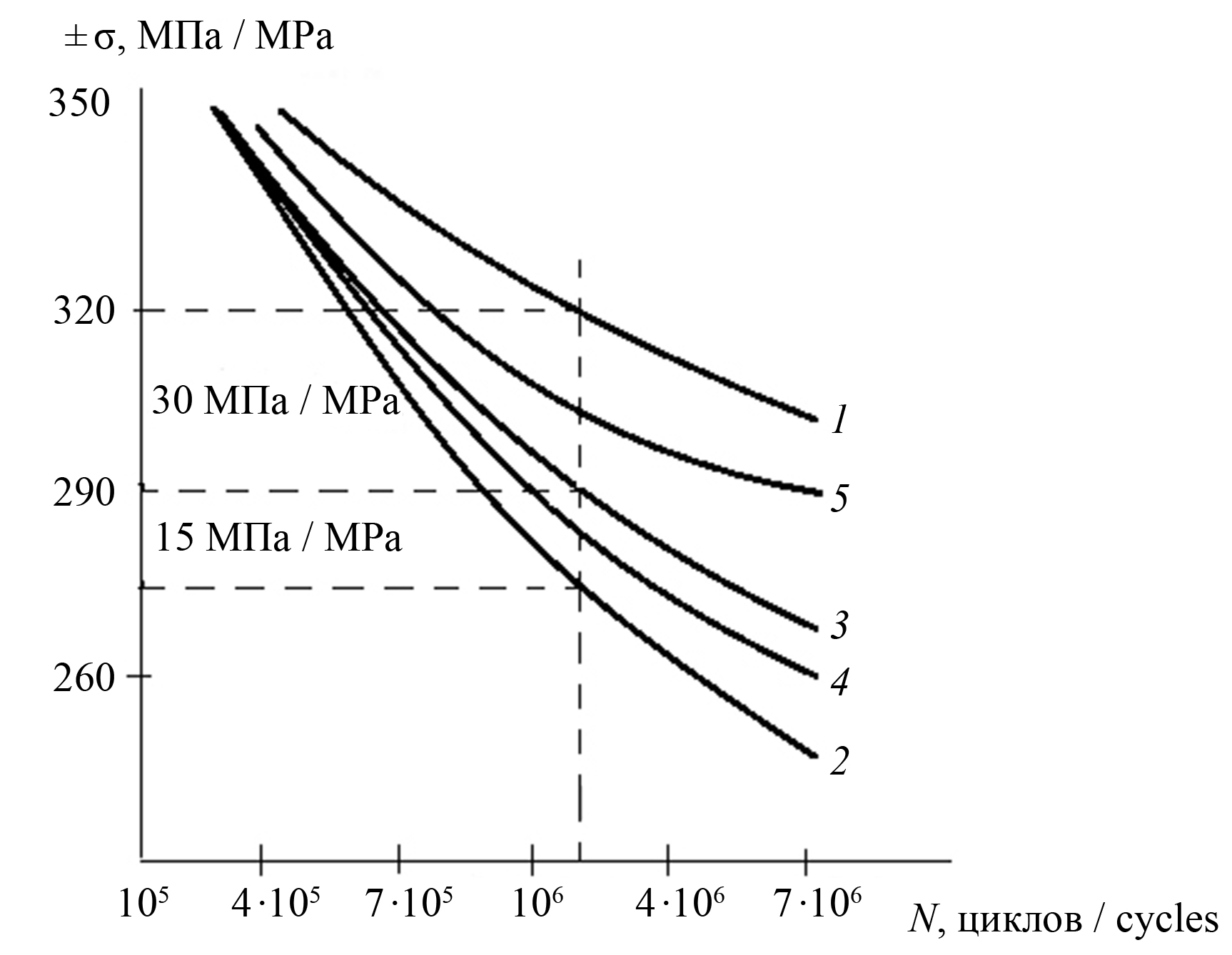 1 – в атмосферных условиях; 2 – в 50%-м растворе противообледенительной жидкости Maxflight 04; 3 – в 50%-м растворе противообледенительной жидкости Maxflight 04 с добавлением 5 г/л монобората калия; 4 – в атмосферных условиях после предварительного воздействия 50%-го раствора противообледенительной жидкости Maxflight 04; 5 – в атмосферных условиях после предварительного воздействия 50%-го раствора противообледенительной жидкости Maxflight 04 с 5 г/л монобората калия; σ – внутреннее напряжение металла, МПа; N – количество циклов до разрушения
