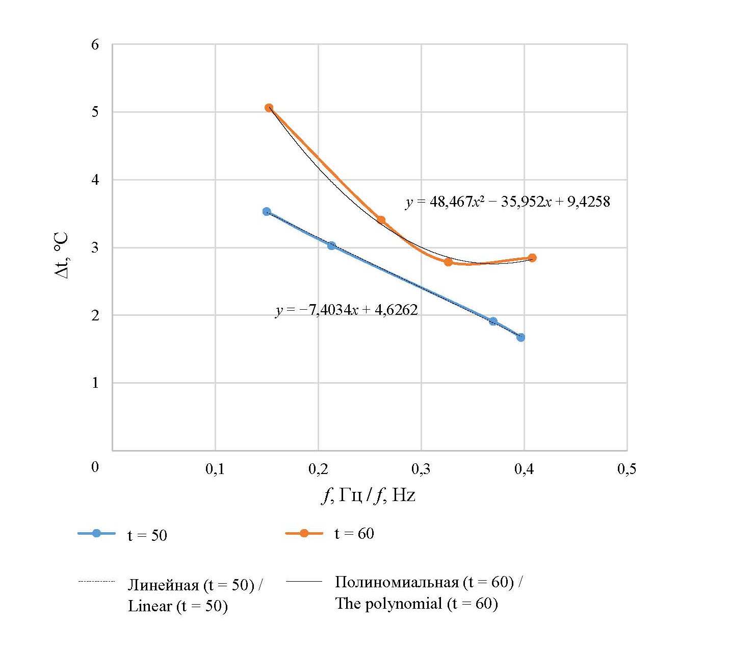 Материалы и методы. При установке экспериментальных зависимостей перепада температур для греющего и нагреваемого контуров отопления реверсивной теплопередачи по одной трубе от частоты пульсаций расхода теплоносителя при разных входных температурах в динамике использовались методы цепей, физического эксперимента, математической статистики. Физический эксперимент проводился последовательно при повышении и понижении температуры теплоносителя (50 и 60 °С).