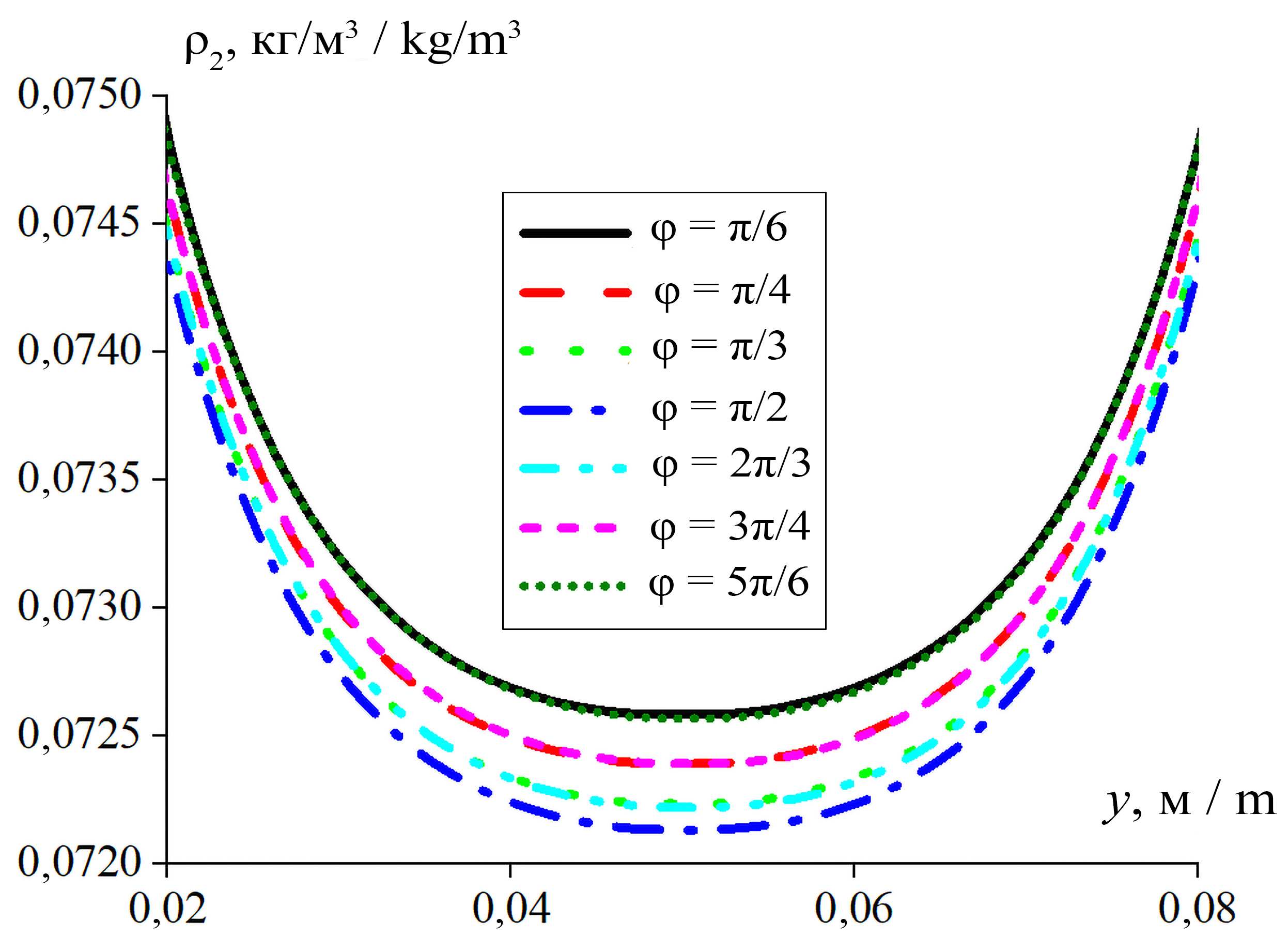 На рисунке 5 показано распределение средней плотности пылевой фракции газовзвеси вдоль оси у (х = L/2) канала при различных углах втекания капельных фракций, наименьшее значение средней плотности пылевой фракции наблюдается вблизи оси симметрии канала. Минимальное значение средней плотности достигается для угла φ = π/2. Значение средней плотности для углов φ и π – φ близки.