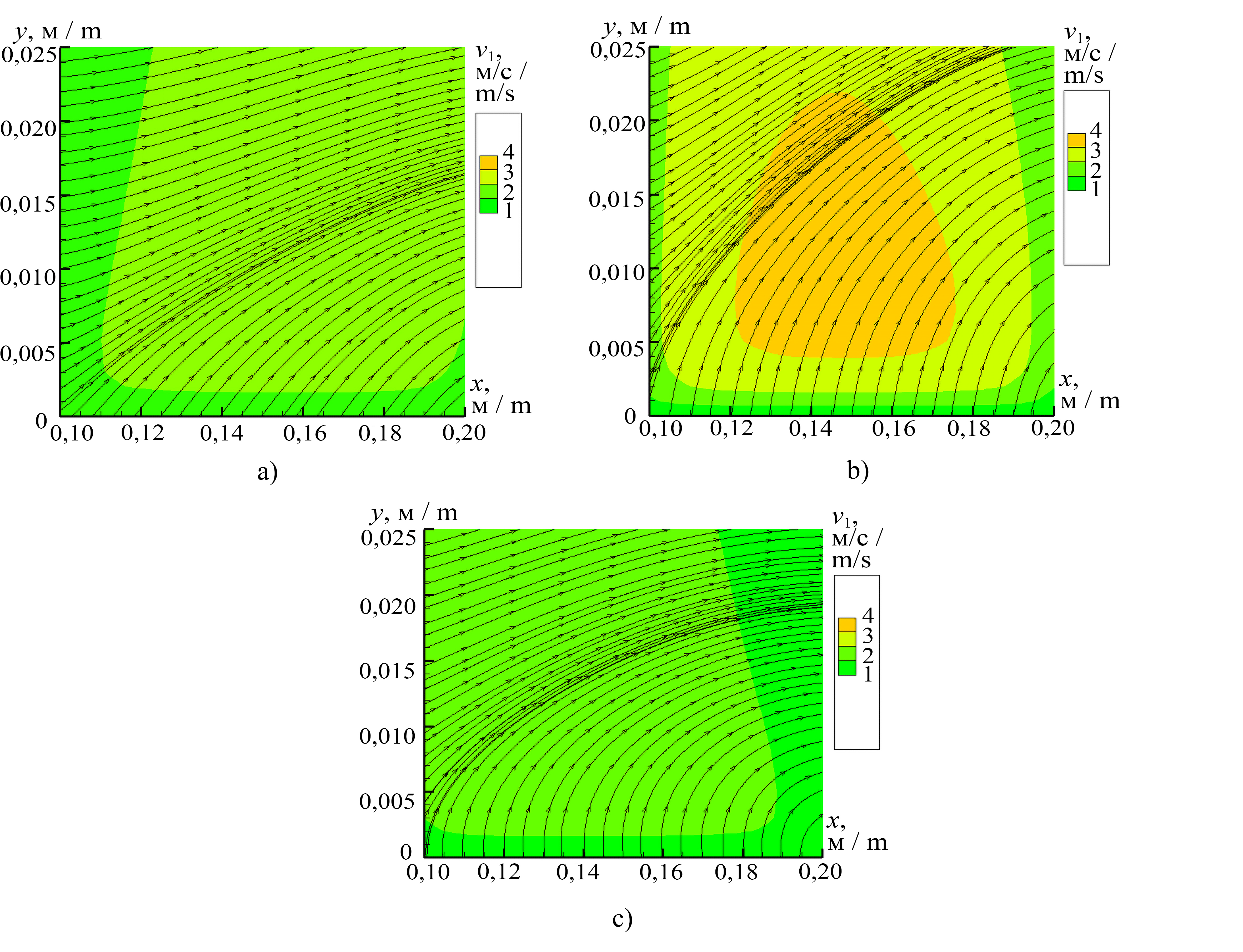 Результаты численных расчетов демонстрируют, что угол вдува газокапельной смеси – φ оказывает влияние на линии тока несущей среды. При остром угле вдува – φ = π/6 (рис. 7 a), линии тока направлены по потоку, разворота линий тока не наблюдается. При этом за счет разности скоростей вдуваемого и основного потока происходит уменьшение скорости движения всей смеси. При вдуве газа под углом – φ = π/2 (рис. 7 b) и тупым углом – φ = 5π/6 (рис. 7 c) наблюдаются отличия линий тока газа. Для тупого угла (рис. 7 c) наблюдается разворот линий тока газа, при этом происходит уменьшение скорости движения несущей среды, связанное с тем, что вдув происходит против движения основного потока. Для углов вдува φ = π/6, φ = π/4, φ = π/3, φ = π/2, φ = 2π/3, φ = 3π/4, φ = 5π/6 максимальные значения модуля скорости несущей среды – max|V1| в поперечном сечении х = L/2, момент времени t = 0,0031 с соответственно – max|V1| = 25,5 м/с, max|V1| = 26,5 м/с, max|V1| = 27,3 м/с, max|V1| = 28,22 м/с, max|V1| = 27,93 м/с, max|V1| = 27,3 м/с, max|V1| = 26,5 м/с соответственно.