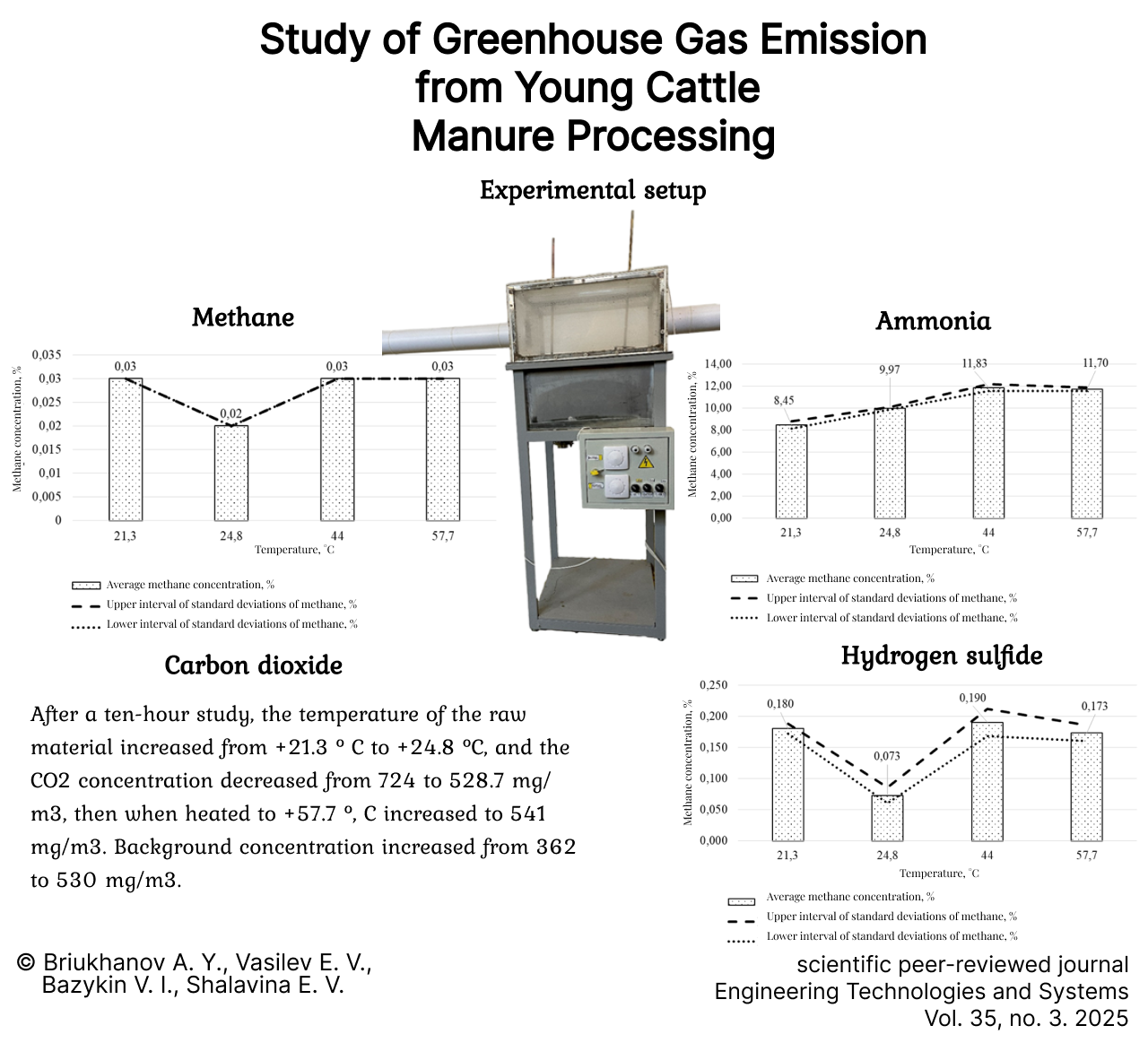Results. The concentrations of ammonia, hydrogen sulfide, methane and carbon dioxide in young cattle manure emissions were determined with the use of four temperature modes. Mean concentrations are within standard deviation intervals confirming statistical reliability.