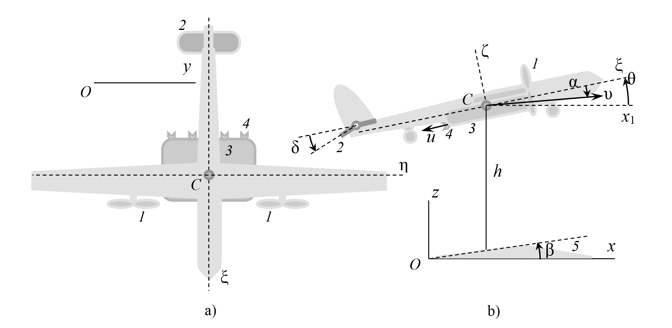 Примечание: Oxyz – неподвижная ортогональная система декартовых координат с началом O на уровне моря, горизонтальными осями Ox, Oy и вертикальной осью Oz, направленной вверх; Cξηζ – связанная с малым беспилотным летательным аппаратом ортогональная система декартовых координат с началом C в центре масс малого беспилотного летательного аппарата, осью Cξ, совпадающей с главной продольной осью инерции малого беспилотного летательного аппарата, перпендикулярной ей осью Cζ в плоскости симметрии малого беспилотного летательного апарата и перпендикулярной обеим этим осям осью Cη; Cx1 – подвижная горизонтальная ось, параллельная оси Ox; x, z – координаты центра масс малого беспилотного летательного аппарата (точки C) в неподвижной системе координат по осям Ox, Oz, м; β – угол наклона средней прямой линии профиля поля в продольной вертикальной плоскости, рад; υ ‒ величина скорости центра масс малого беспилотного летательного аппарата, м/с; α – угол атаки, образуемый продольной осью Cξ и вектором υ или проекцией вектора υ на плоскость симметрии малого беспилотного летательного аппарата, рад; h – высота полета над полем, м; δ – угол поворота руля высоты с отсчетом от нулевого положения, рад; u ‒ величина скорости частиц вещества, распыляемого при обработке поля, относительно корпуса малого беспилотного летательного аппарата в направлении, противоположном направлению продольной оси Cξ (u > 0), м/с;