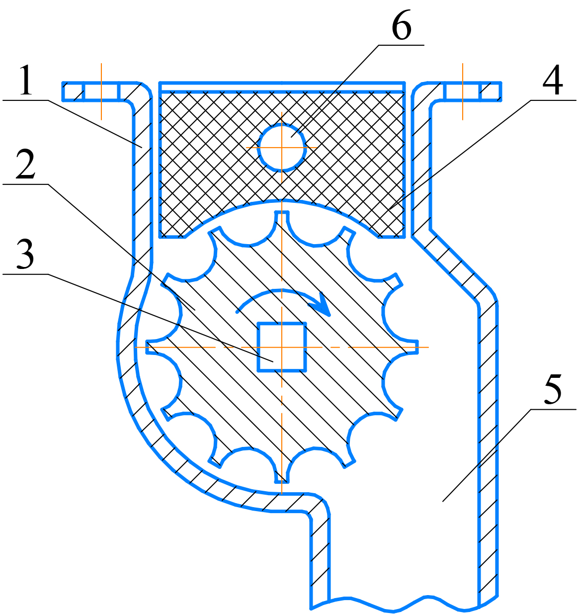 Рис. 1. Катушечный высевающий аппарат: 1 ‒ корпус; 2 ‒ желобчатая катушка; 3 ‒ приводной вал; 4 ‒ пластмассовая заслонка; 5 ‒ семенной канал и семянаправитель; 6 ‒ валик