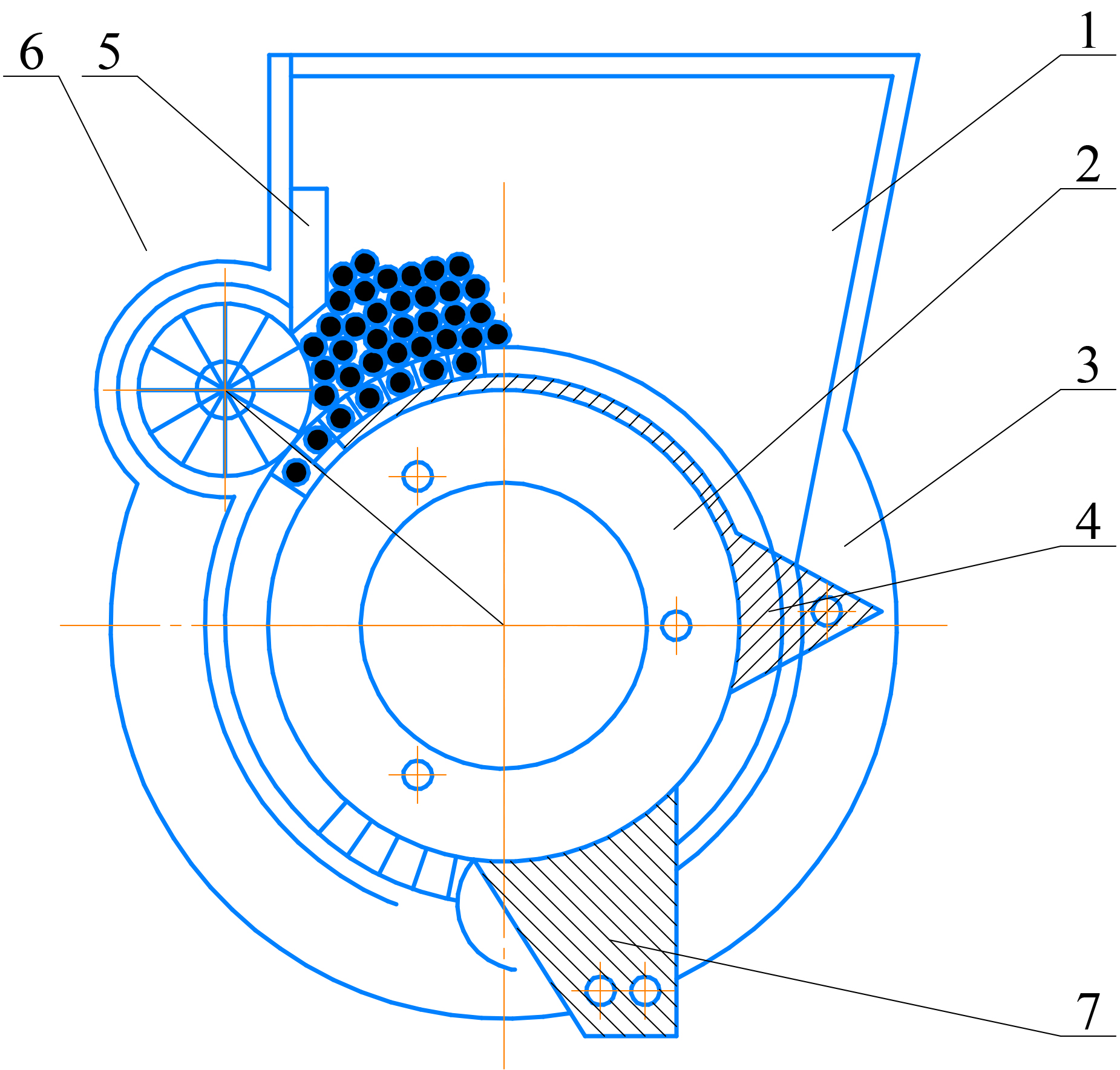 Fig. 1. Roller feed unit: 1 ‒ housing; 2 ‒ grooved roller; 3 ‒ drive shaft; 4 ‒ plastic flap; 5 ‒ seed channel and seed guide; 6 ‒ spindle