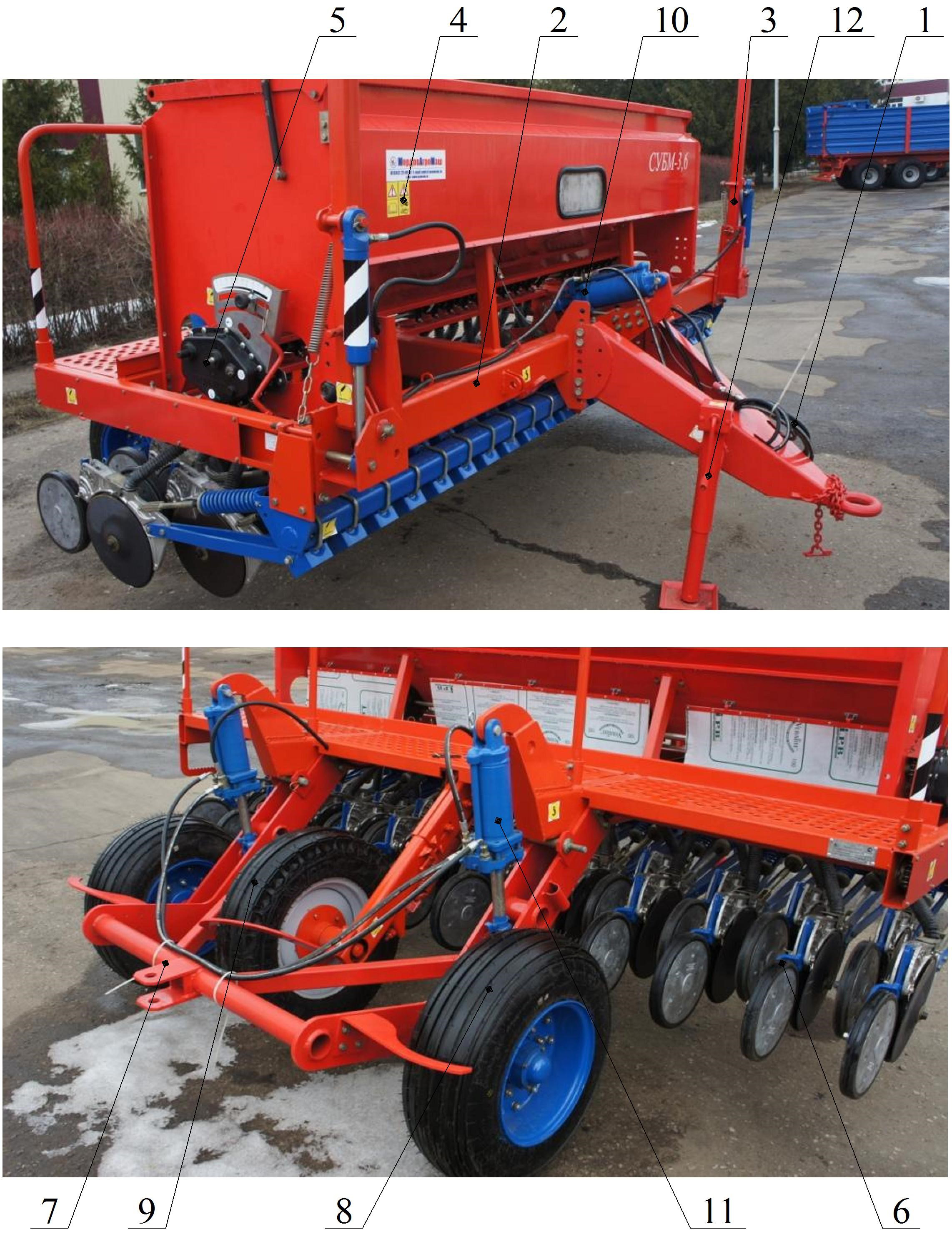 Конструкция сеялки в общем виде (рис. 5) представляет собой гидравлическую систему 1, раму со сницей 2, на которой смонтирован пружинно-гидравлический механизм сошниковой группы 6, маркеры с гидравлическим приводом 3, зерновой и туковый высевающие аппараты с бункерами 4, механизм привода зернового и тукового высевающих аппаратов 5, рама 7 с опорными колесами 8, приводное колесо 9 с механизмом привода, механизм подъема сошников 10, механизм управления опорными колесами 11, трубопроводы гидравлической системы сеялки 1 и опорная стойка 12 [19]8.