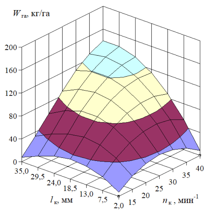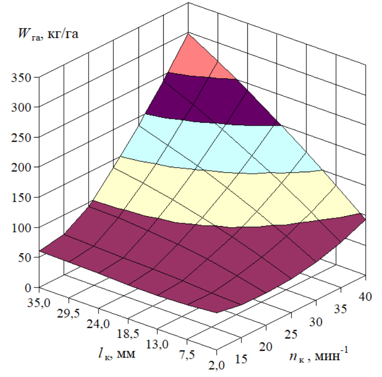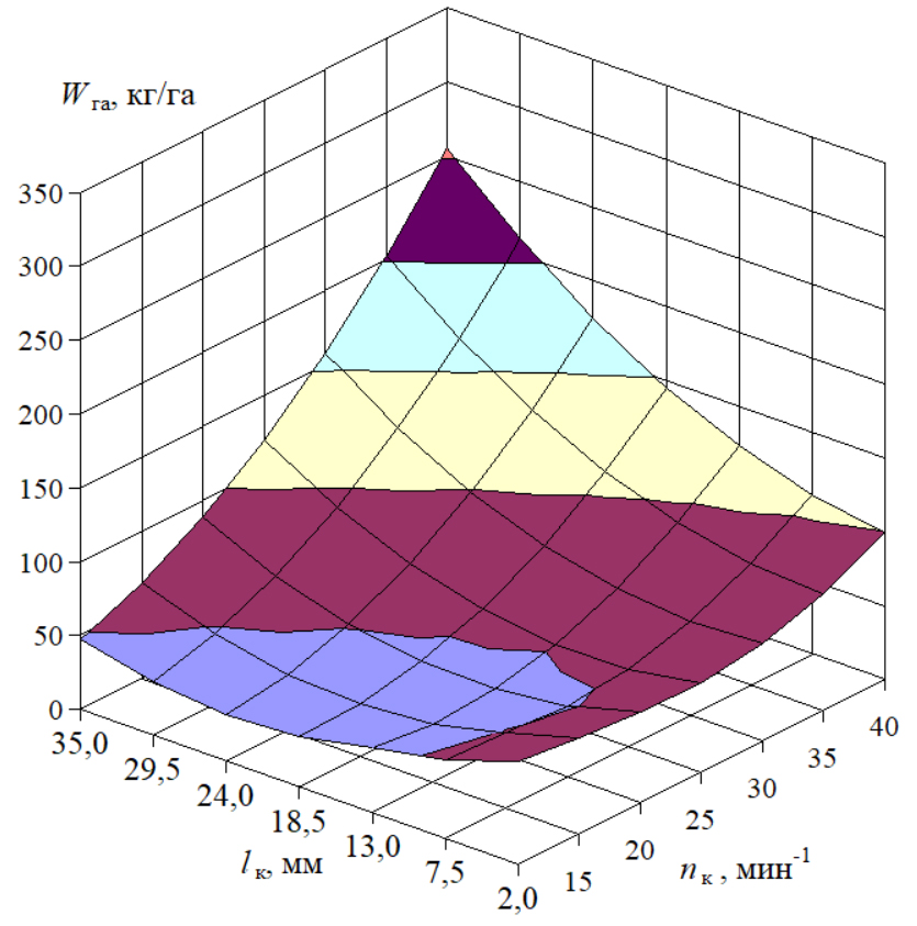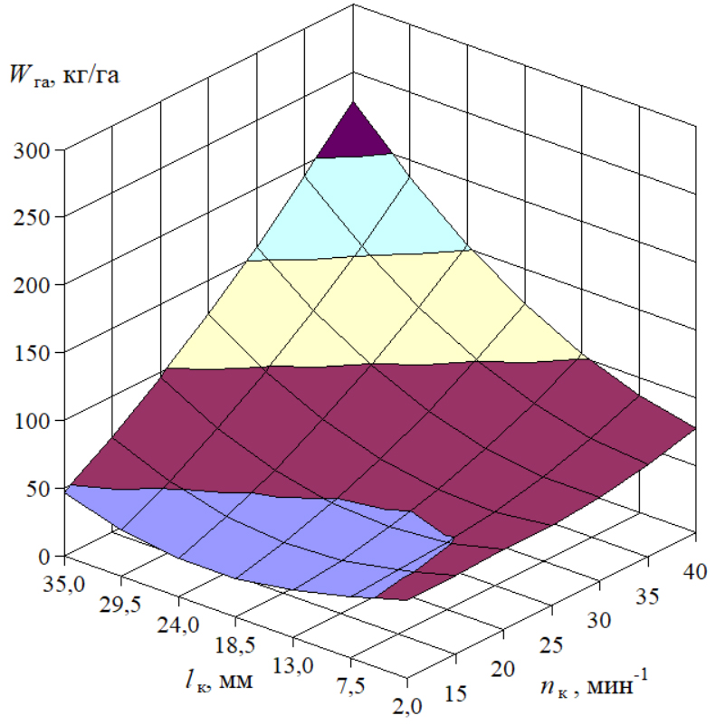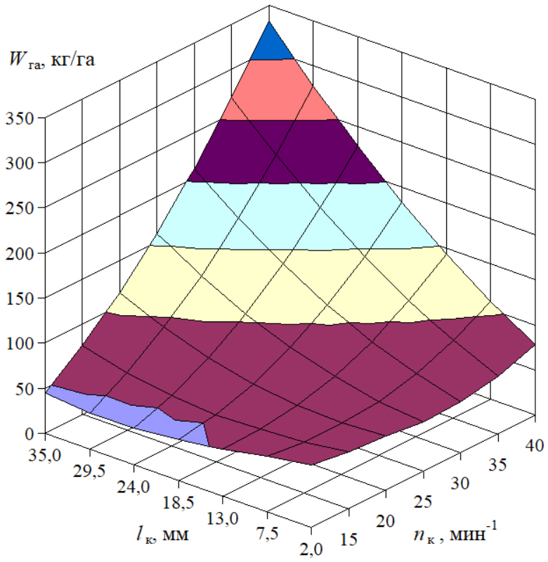 Fig. 6. Model of the dependence of the rates of seeding wheat by the roller feed unit on the rotation frequency and the roller operating length