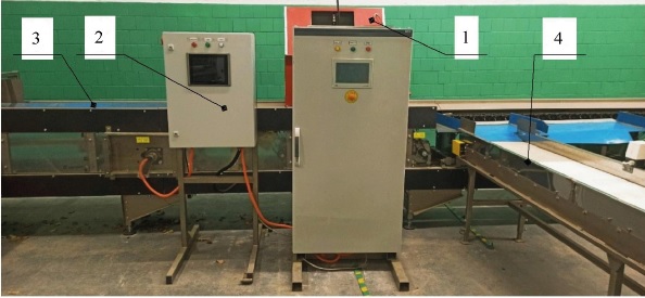 11. Fig. 10. Vision system of sorting line LSP-4: 1 – optical module with a video camera and structural illumination; 2 – electronic control unit; 3 – conveyor; 4 – output conveyor for sorted fruits