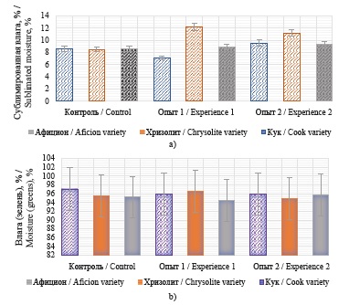 Известно, что вода в пищевых продуктах играет важную роль, так как обусловливает консистенцию и структуру продукта, а ее взаимодействие с присутствующими компонентами определяет устойчивость продукта при хранении [30]. Для оценки водной активности был проведен физико-химический анализ по содержанию сублимированной влаги, % (рис. 4a) и влаги в зелени, % (рис. 4b) в исследуемых образцах салата. По данному показателю все исследуемые образцы салата относятся к продуктам с высокой влажностью.