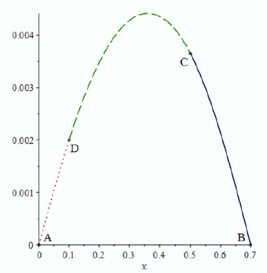 Зададимся теперь целью определения всех таких вариантов нагружения вала, при которых опасное сечение расположено не на границе двух зон с заданным законом распределения момента, проходящим через точку С, а на участке СD. Такое положение дел приводит нас к необходимости более детального исследования уравнения изменения момента на исследуемом участке. Указанный случай обычно не учитывается в инженерных расчетах валов на прочность. Реализация такого сценария происходит, когда абсцисса вершины параболы CNB (рис. 4) расположена правее точки С. В общем случае она определяется следующим соотношением: