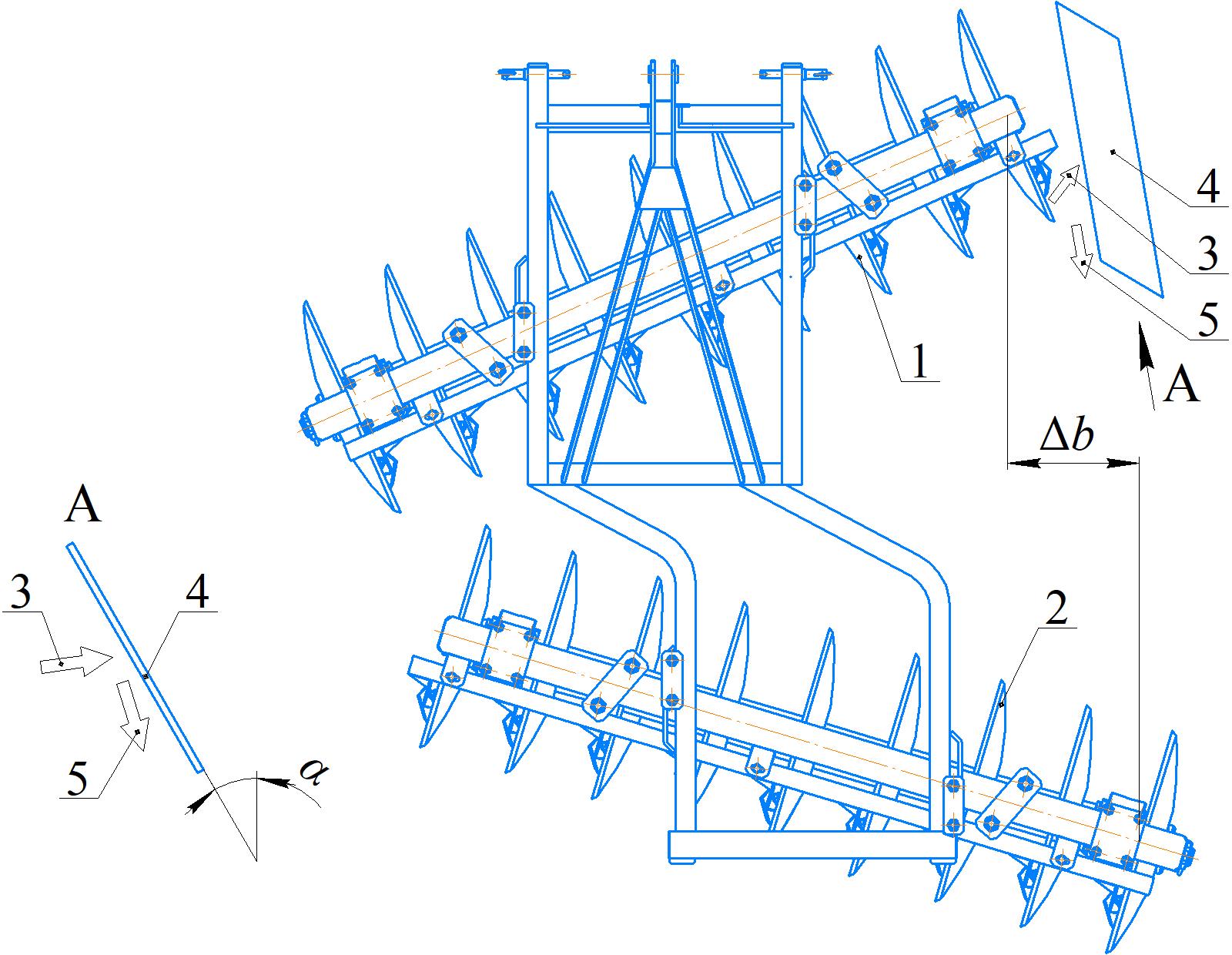 На первом этапе разработки была предпринята попытка решить проблему за счет увеличения поперечного сдвига ∆b между передней и задней батареями до 0,4 м. Качество работы существенно улучшилось, но полностью исключить чрезмерный боковой отброс почвы не удалось. При этом не удалось решить проблему и путем использования фрезерного ограничителя ряда, ножи которого перемещают почву в сторону междурядья [14]. Дело в том, что отдельные фрагменты отбрасываемой крайним диском передней батареи почвенной ленты достигали оснований ряда малины и проникали между стеблями, в связи с чем возврат почвы в междурядье становился невозможным.