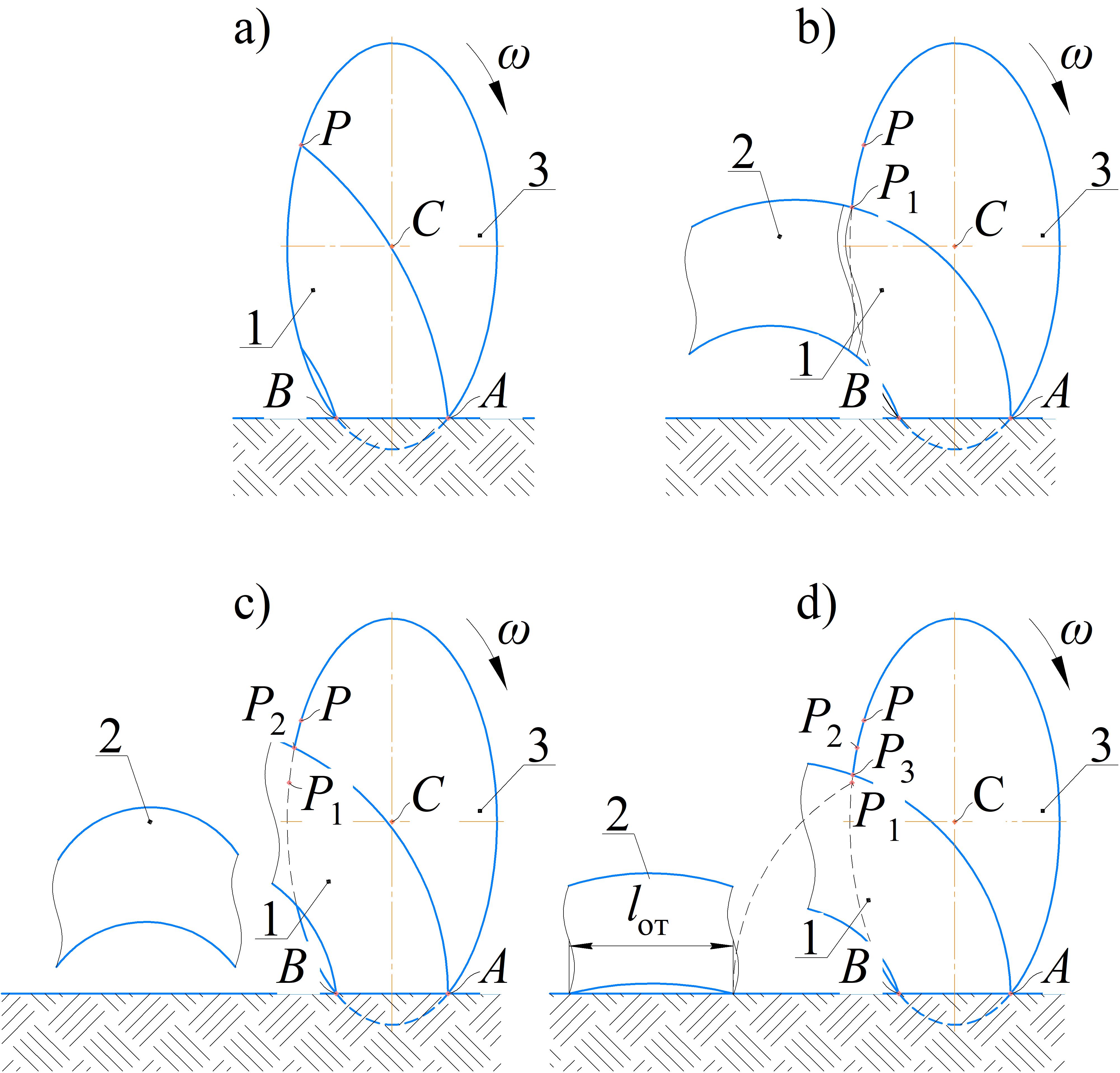 Движение почвенной ленты, отрезанной крайним диском передней батареи орудия по его рабочей поверхности, условно можно разделить на следующие фазы. Подъем переувлажненной, уплотненной и задернелой почвенной ленты по вогнутой поверхности сферического диска из точки А в точку Р, как правило, происходит без ее разрушения (рис. 3 а). Отрезанная почвенная лента 1 при выходе за пределы диска 3 продолжает свое движение по криволинейной траектории, соответствующей радиусу кривизны рабочего органа и углу атаки (рис. 3 b). При этом длина отделившейся почвенной ленты носит вероятностный характер и зависит от ее физико-механических свойств. Далее под действием собственного веса и сил инерции консольная часть пласта почвы 2 отделяется от монолита и совершает свободное падение под углом к горизонту (рис. 3 c). При этом дальний край отделившейся части почвенной ленты 2 оказывается отброшенным дальше на ее длину lот в сравнении с отдельно взятой материальной точкой полностью разрушенного пласта (рис. 3 d). Момент от сил трения увлекает за собой контактирующий пласт почвы 1 с рабочим органом и поднимает его в точку Р2 (рис. 3 c). Дальнейшее перемещение бороны приводит к удлинению выступающей части почвенного пласта 1 за пределы диска и его сползанию вниз в направлении точек Р3 и Р1 (рис. 3 d). Эта гипотеза была принята в качестве основной при проведении теоретических исследований.