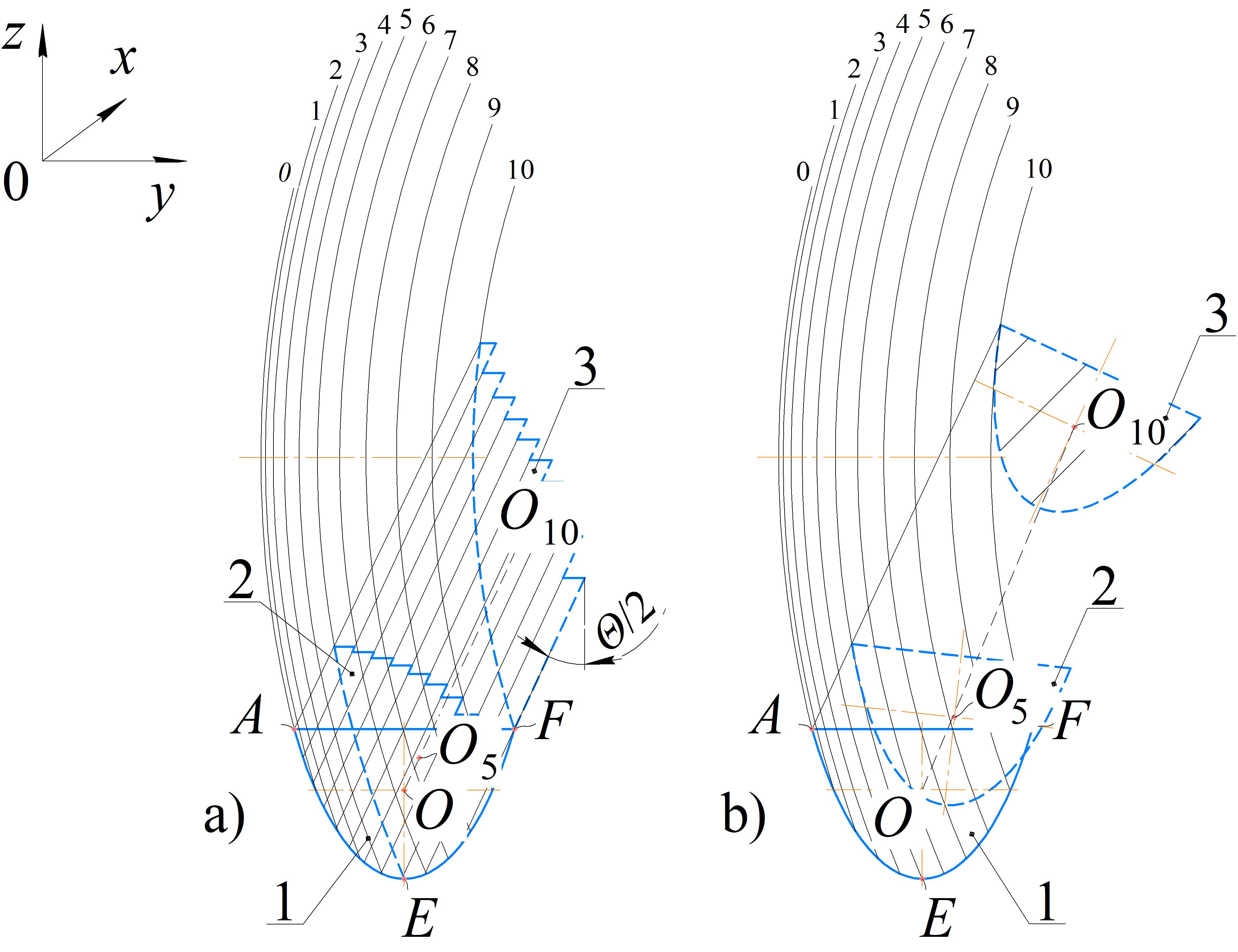 Положение центра тяжести почвенной ленты (точка О, рис. 4) определяли в программе «КОМПАС-3D» посредством сечения сферического диска десятью параллельными плоскостями, сориентированными перпендикулярно по отношению к направлению движения дисковой бороны [38]. Полученные по результатам построения точки были аппроксимированы полиномом третьей степени, что позволило при его дифференцировании определить скорость и ускорение пласта почвы при разных положениях его на рабочей поверхности сферического диска.