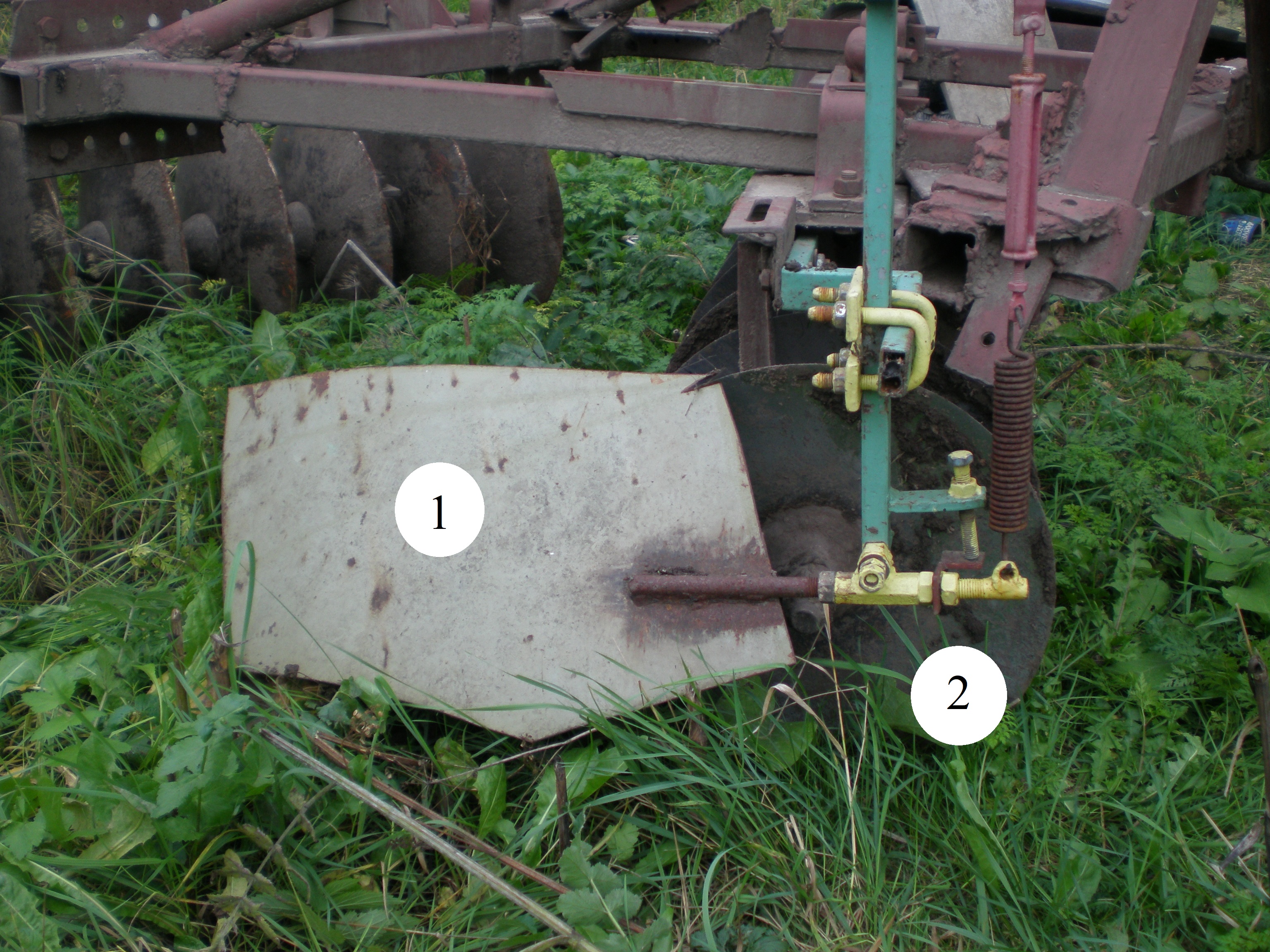 1 – front disc battery; 2 – rear disc plate; 3 – soil discarded by the disc; 4 – protective shield;