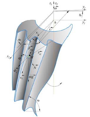 Discussion and Conclusion. There is a directly proportional decrease in the time of motion of the particle along the working body tooth surface with increasing the angular velocity. At the same time, increasing the angle leads to the increase of the time of the particle along the tooth surface. The increase of angular velocity values leads to decreasing particle displacement along the axis. At the angle of 45° displacement along the axis is 1.1‒1.5 times less than at an angle of 70°. At high angular velocities, the moving along the axis is minimal. The analysis, given the need to create a smoother motion of the particle along the helical line, shows that the most rational will be the following values: angle 70° and angular velocity of the working body 185‒206 rad/s.