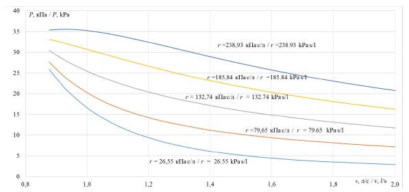 На рисунке 7 приведены зависимости p = f(v) при фиксированном объеме мембранного насоса Vб = 5 л для пяти гидравлических активных сопротивлений тепловой сети.
