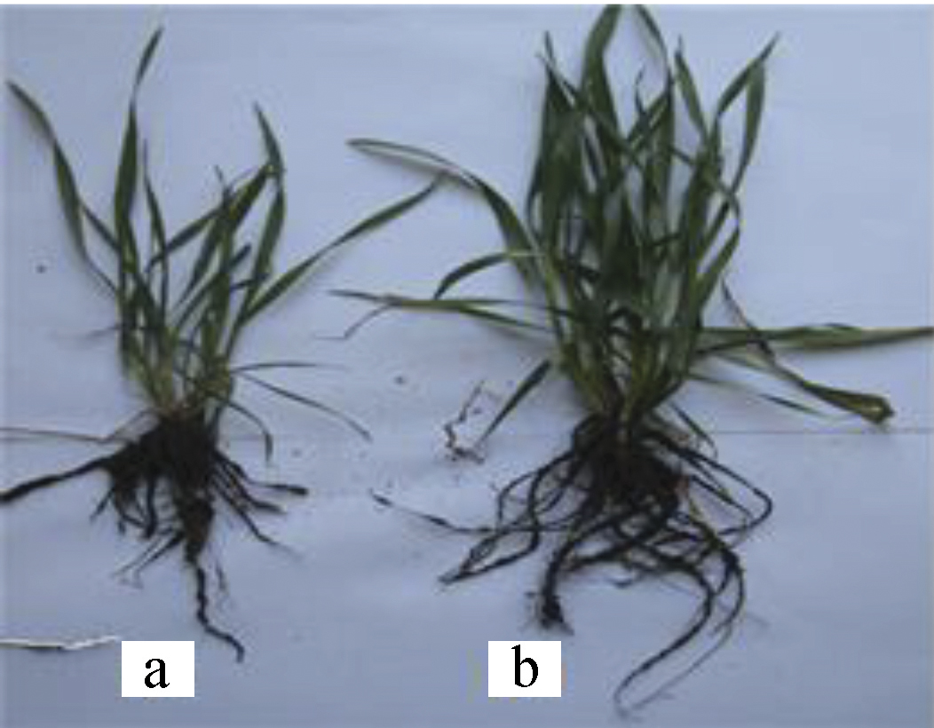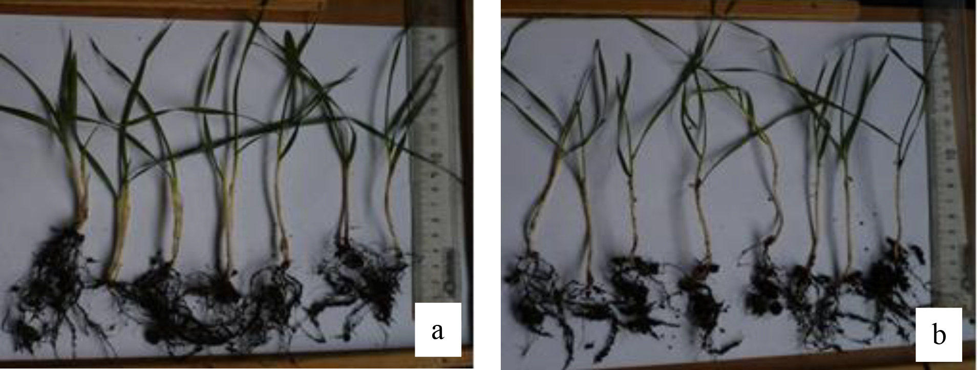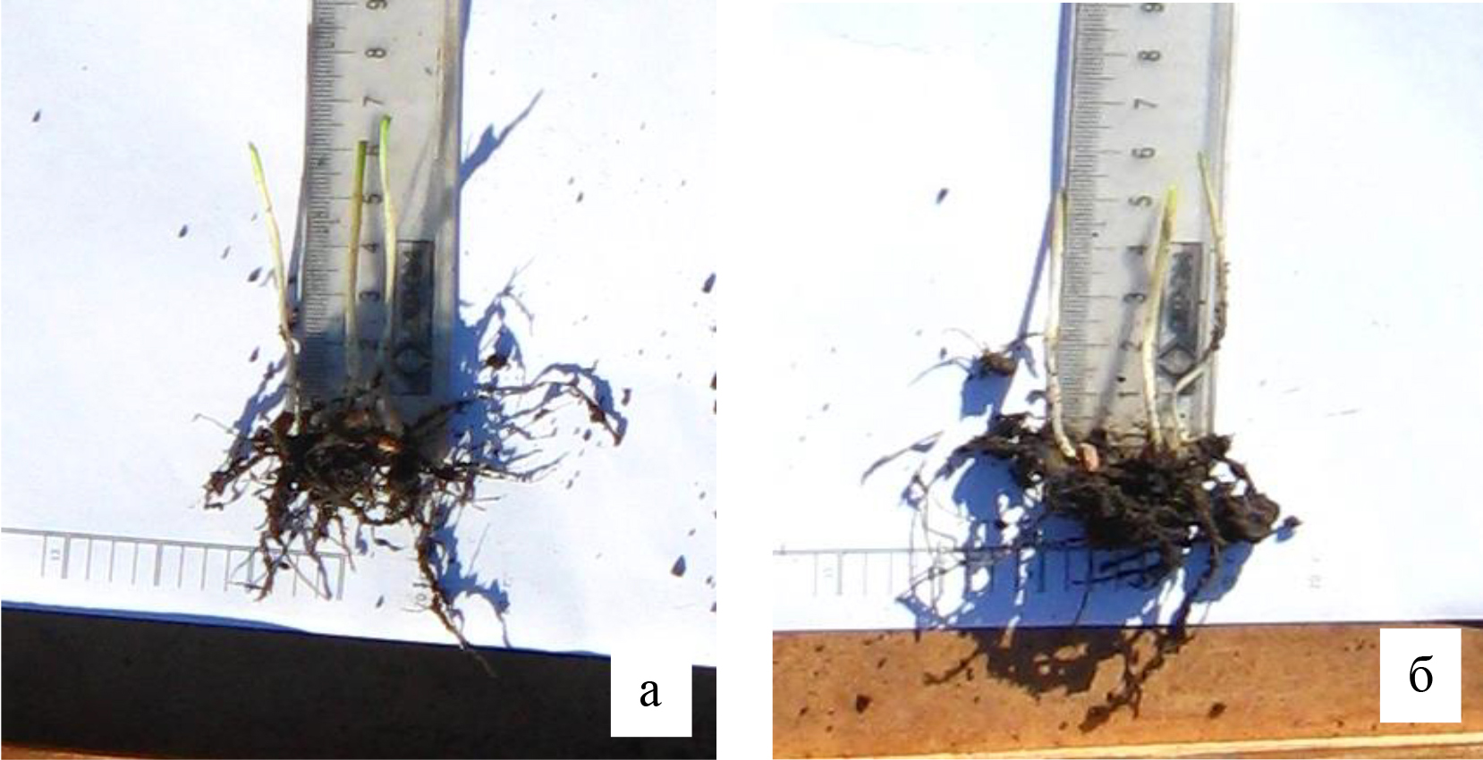 Р и с. 2. Состояние корневой системы растений озимой пшеницы сорта РС-1 «Таня» с нормой высева 2,6 (а) и 6,5 млн шт/га (b)