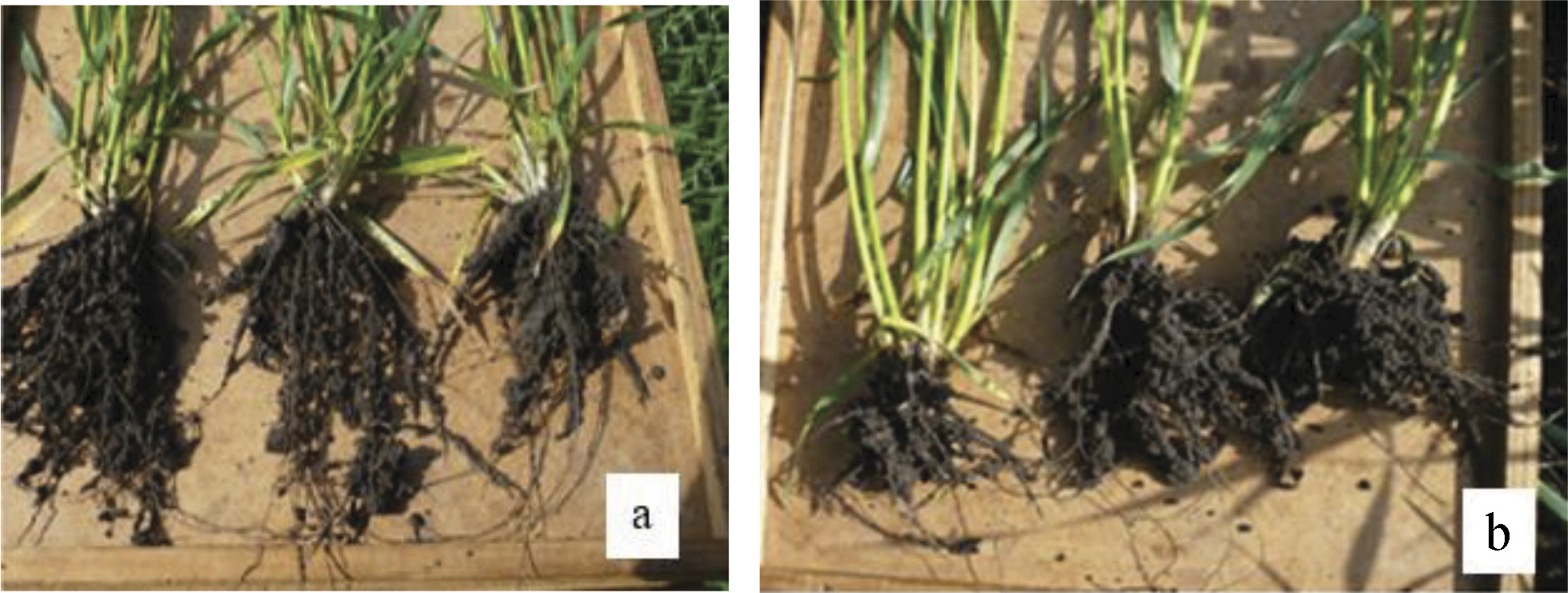 F i g. 4. Condition of the root system of winter wheat plants of the “Tanyaˮ RS-1 variety in spring with a seeding rate of 2.6 (a) and 6.5 million units/ha (b)