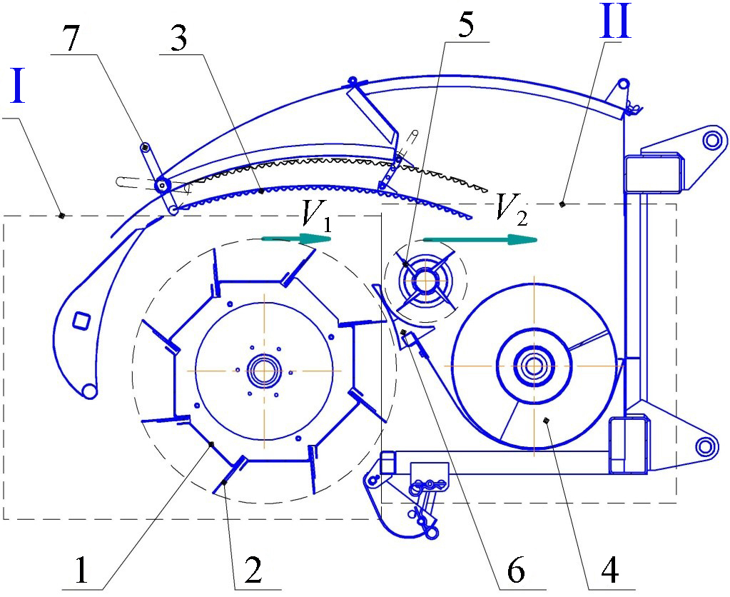 F i g. 1. The scheme of the harvesting unit with a new aggregate I – combing block; II – threshing block; 1 – combing drum; 2 – combing combs; 3 – replaceable decks; 4 – transporting screw; 5 – blade beater; 6 ‒ cutting flap; 7 – mechanism of parallel and angular displacement; V1 – linear velocity at the radius of the combing drum; V2 – linear speed at the radius of the blade beater
