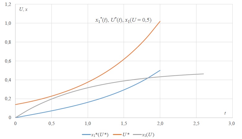 Постоянные интегрирования определяются из граничных условий. Пусть x1(0) = 0, x1кон = 0,5 при T = 2. Графики переходных процессов для координаты x1*(t) = 0,069(et + e–t) и оптимального программного управления U *(t) = 0,138e t приведены на рисунке 1. При этом затраты энергии что на 30,7 % меньше, чем энергозатраты в разомкнутой системе с управлением U*(t) = 0,5 на интервале времени t [0, 3]. Но аналитически выразить U* через x1* из-за трансцендентности невозможно, к тому же нужно будет дополнительно решать задачу стабилизации конечного состояния.