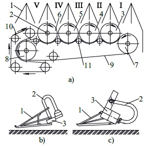 - С волнообразным ленточно-роликовым ручьем (рис. 1c). Достоинства: большая зона и симметричный процесс теребления растений, надежность технологического процесса, минимальная растянутость стеблей в ленте. Недостатки: скольжение ремней относительно друг друга на криволинейных участках ручья, повреждение стеблей, износ ремней, большая энергоемкость и сложность конструкции.