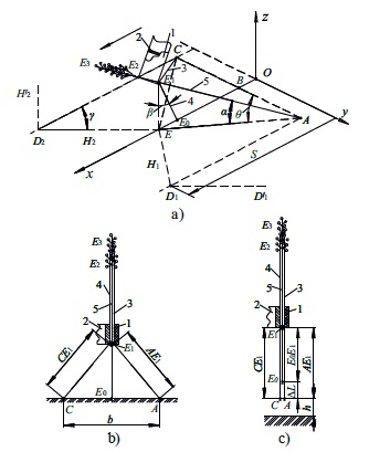 Анализ влияния делителей на стебли льна без учета сцепления их верхних частей семенными коробочками изложен в ряде работ13. Ниже приводится определение комлевой растянутости пучка растений, сцепленных семенными коробочками в зоне Е2Е3. На схеме (рис. 5a) площадь D2CAD1 – горизонтальная поверхность поля, с которой жестко связана система координат хОуz.