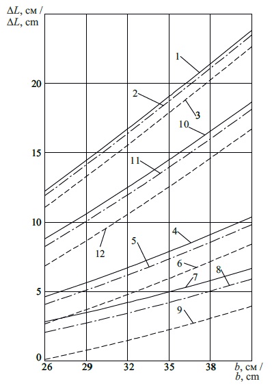 В соответствии с формулой (4) проведены расчеты и определена комлевая растянутость ∆L в зависимости от ширины захвата b теребильной секции для ряда значений Zк, θ и β. Зависимость графически показана на рисунке 6.