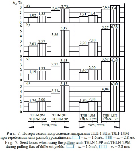 Из рисунка 7 следует, что при уборке льна аппаратом ТЛН-1,9П потери bс семян резко возрастают в сравнении с потерями при использовании ТЛН-1,9М. Рост потерь семян bс имеет место во всех вариантах лабораторно-полевого опыта: на низкоурожайном (Ус = 0,3 т/га) и высокоурожайном (Ус = 0,73 т/га) льне, в ранней желтой (рис. 7a), желтой (рис. 7c) и полной (рис. 7d) спелостях прямостоящего льна, а также в ранней желтой спелости полеглого льна (рис. 7b).