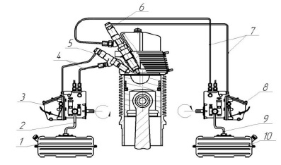 3, 8 – high-pressure fuel pumps; 4, 7 – high-pressure fuel lines; 5 – ignition fuel nozzle (rapeseed oil);