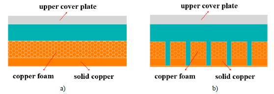 From the current progress, researches on boiling heat transfer enhancement of copper foam were mainly concentrated in the field of pool boiling, and less studies on flow boiling. In the liquid cooling application, introduction of copper foam may greatly increase the flow resistance compared with the empty channel, resulting in an increase in pump power consumption. The groove structure of copper foam can mitigate the contradiction between these two [13; 14]. On one hand, processed grooves can reduce the flow resistance; on the other hand, it can also help the smooth separation of bubble form liquid and improve the critical heat flux (CHF).