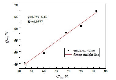 According to previous researches, it was found that the heat loss of the heat sink was related to the temperature difference between copper block and environment. It is found that there is a linear relationship between the two. Extrapolation method from single-phase measurement is to estimate the heat loss of two-phase process. The linear function was regressed in Figure 4 in the mass flux of 18.6 kg/m2·s.