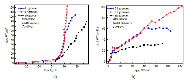 Corresponding HTC curves are displayed in Figure 5b for copper foam samples with 90% and 90 PPI. From Figure 5b, two grooved samples are almost similar in performance with that of the grooveless sample in the single-phase region. After larger than 10 W/cm2, HTC curves of two grooved samples increase more rapidly than the grooveless sample. When the heat flux is larger than 60 W/cm2, the HTC curves of 17-grooved samples continue to exhibit an increase trend while that of 11-grooved begins to fall gently. Seventeen-groove copper foam reaches the largest HTC of 100 kW/(m2·K) in the heat flux of 123 W/cm2, which is three times as large as that of grooveless sample.