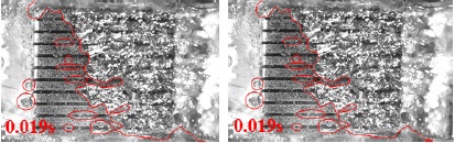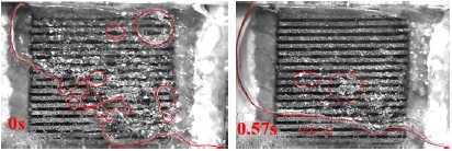 When the heat flux continues to increase to 116.8 W/cm2, the 11-groove sample has reached CHF. As shown in Figure 11, at t = 0 s, the vapor mass occupied half of the sample area, and it developed to two thirds area up to t = 0.019 s. The CHF is triggered by large area drought. For the 17-channel sample, the CHF is triggered in a heat flux of 129 W/cm2, which visual image was shown in Figure 12. At t = 0 s, a large vapor mass completely covers the region of one side and results in uneven liquid inflow. After 0.57s, the air mass spreads almost the whole region, only four channels of one side as liquid inlet. Bubbles are being generated continuously and grew up under the vapor mass. The CHF is also resulted from large area drought.